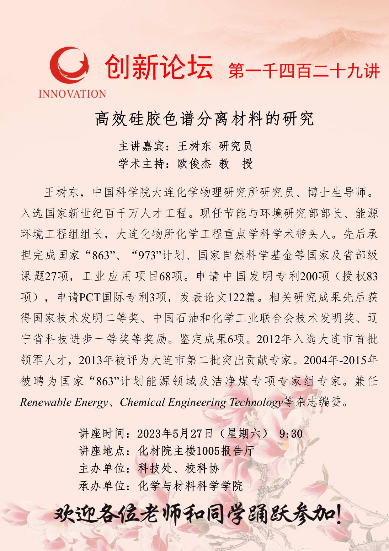 王树东 研究员 乐动网页版登录入口创新论坛第一千四百二十九讲:高效硅胶色谱分离材料的研究 讲座时间 2023年5月27日(星期六) 9:30 讲座地点 化材院主楼1005报告厅 讲座人介绍 王树东 研究员 讲座内容