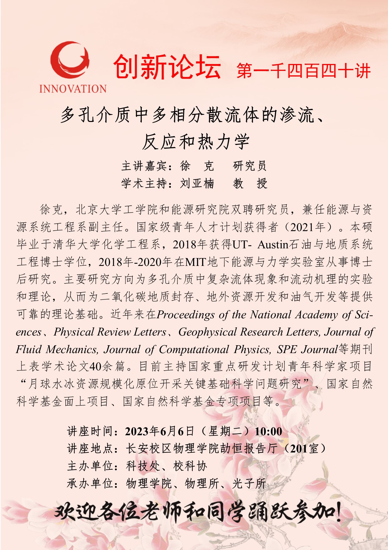 徐克 研究员 乐动网页版登录入口创新论坛第一千四百四十讲:多孔介质中多相分散流体的渗流、反应和热力学 讲座时间 2023年6月6日(星期二)10:00 讲座地点 长安校区物理学院劼恒报告厅(201室) 讲座人介绍 徐克 研究员 讲座内容