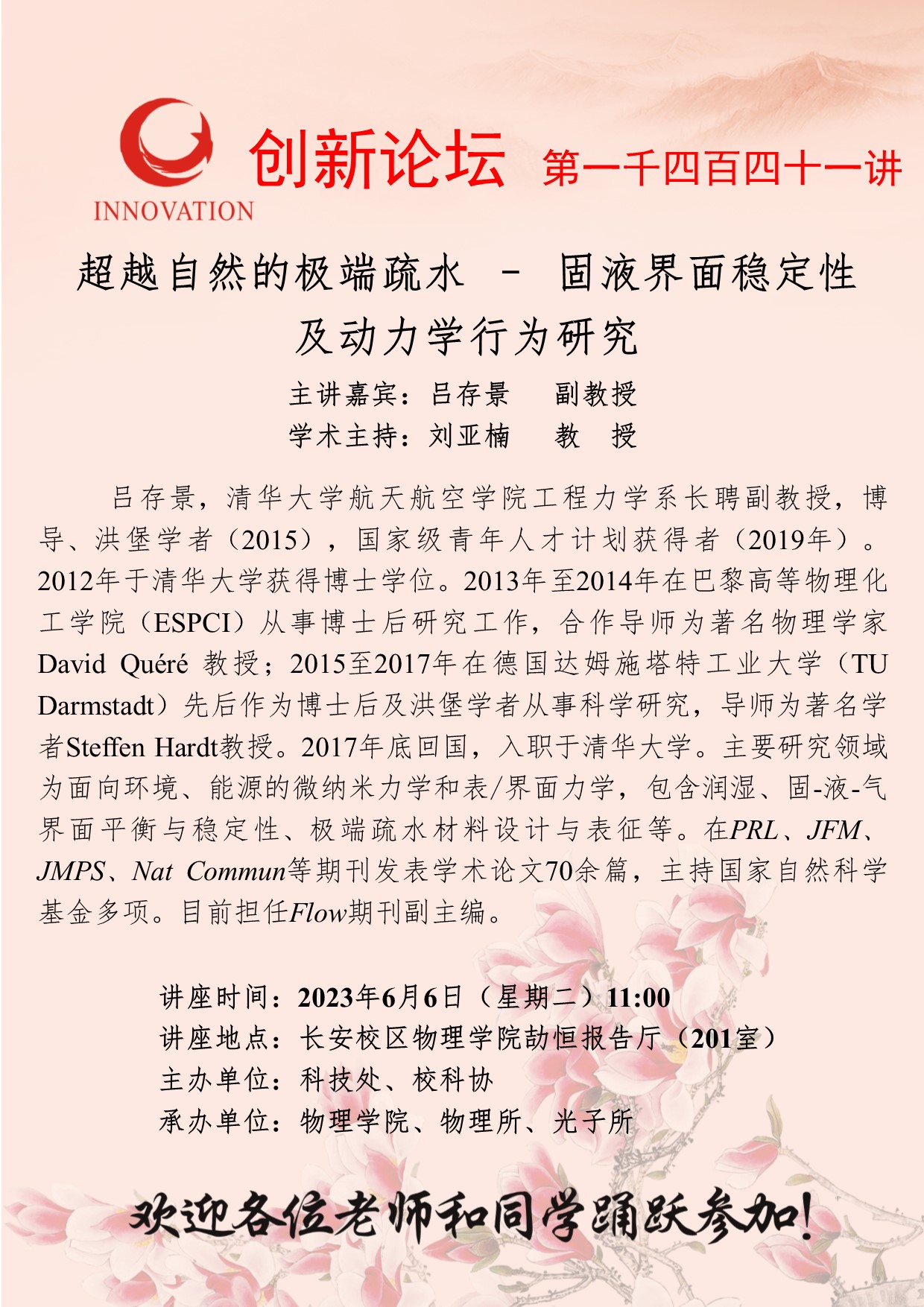 吕存景 副教授 乐动网页版登录入口创新论坛第一千四百四十一讲:超越自然的极端疏水 – 固液界面稳定性及动力学行为研究 讲座时间 2023年6月6日(星期二)11:00 讲座地点 长安校区物理学院劼恒报告厅(201室) 讲座人介绍 吕存景 副教授 讲座内容