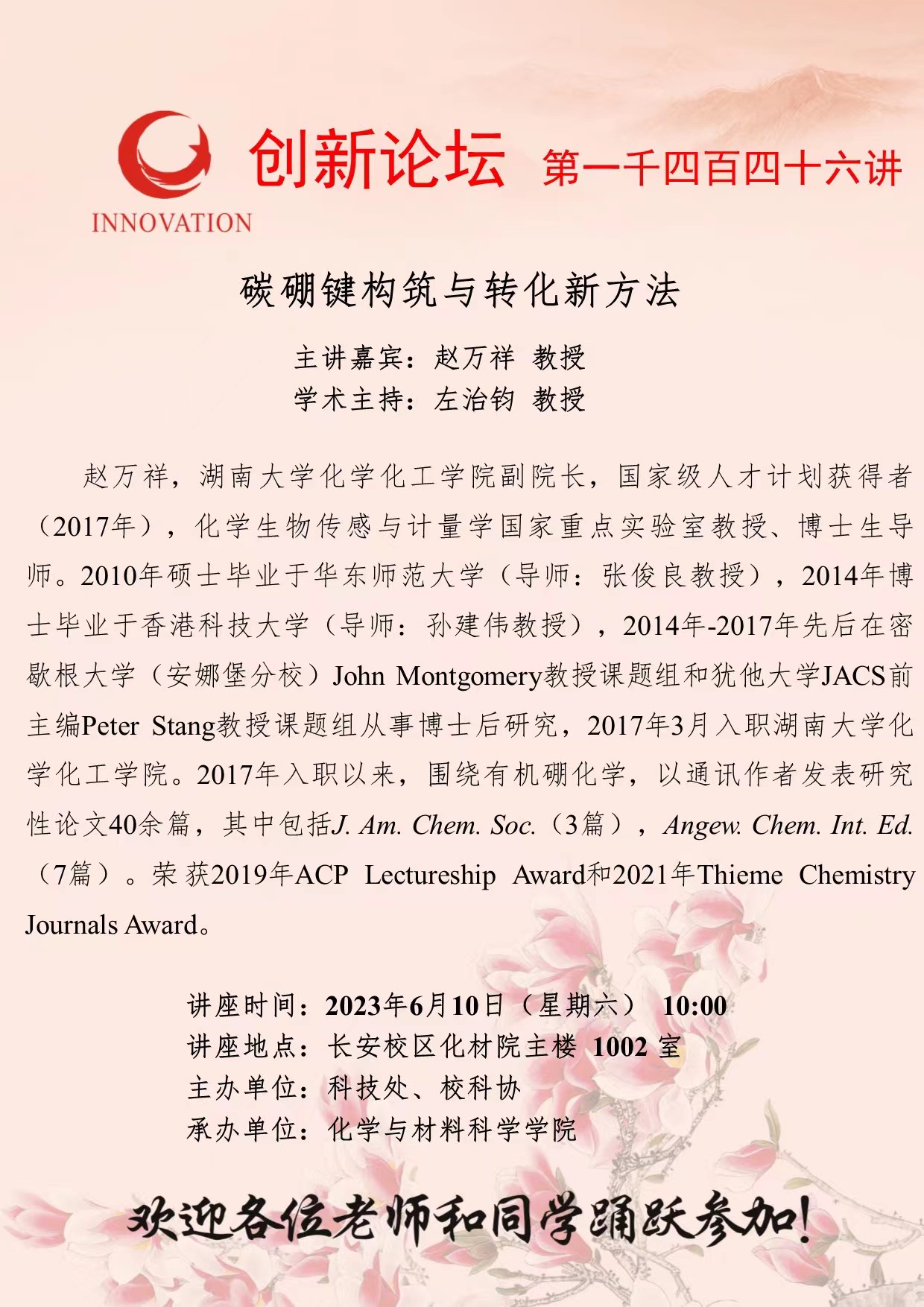赵万祥 教授 乐动网页版登录入口创新论坛第一千四百四十六讲:碳硼键构筑与转化新方法 讲座时间 2023年6月10日(星期六) 10:00 讲座地点 长安校区化材院主楼 1002 室 讲座人介绍 赵万祥 教授 讲座内容