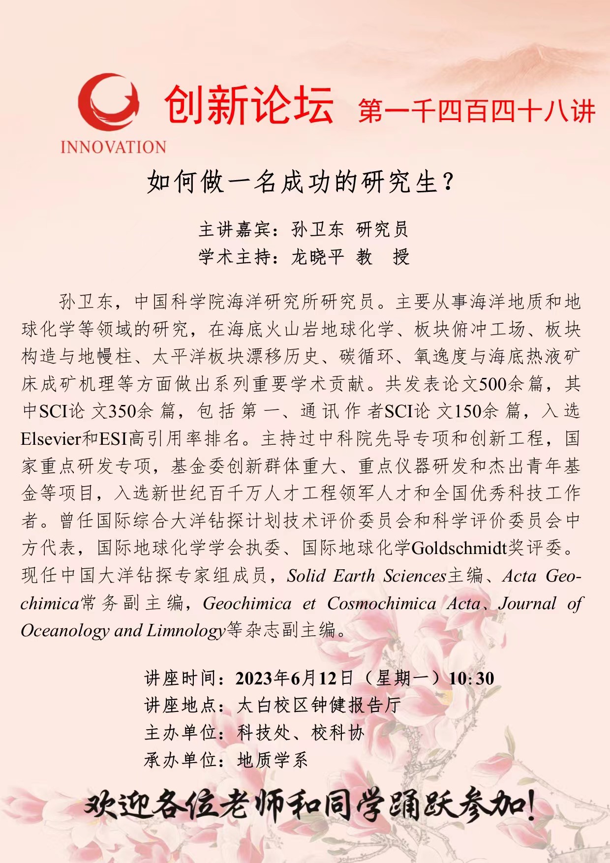 孙卫东 教 授 乐动网页版登录入口创新论坛第一千四百四十八讲:如何做一名成功的研究生? 讲座时间 2023年6月12日(星期一)10:30 讲座地点 太白校区钟健报告厅 讲座人介绍 孙卫东 教 授 讲座内容