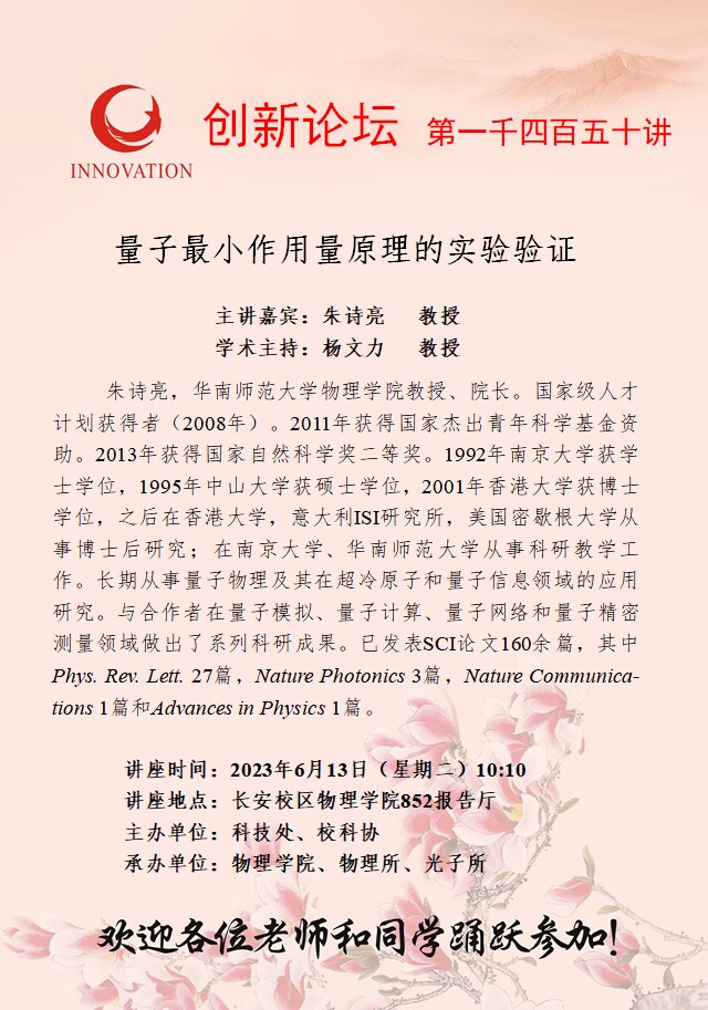 朱诗亮 教授 乐动网页版登录入口创新论坛第一千四百五十讲:量子最小作用量原理的实验验证 讲座时间 2023年6月13日(星期二)10:10 讲座地点 长安校区物理学院852报告厅 讲座人介绍 朱诗亮 教授 讲座内容