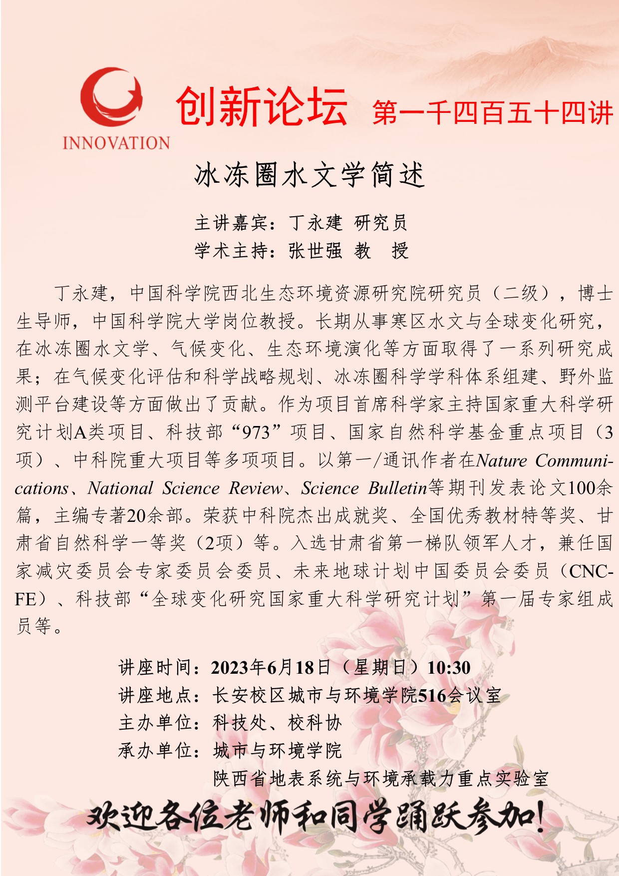 丁永建 研究员 乐动网页版登录入口创新论坛第一千四百五十四讲:冰冻圈水文学简述 讲座时间 2023年6月18日(星期日)10:30 讲座地点 长安校区城市与环境学院516会议室 讲座人介绍 丁永建 研究员 讲座内容