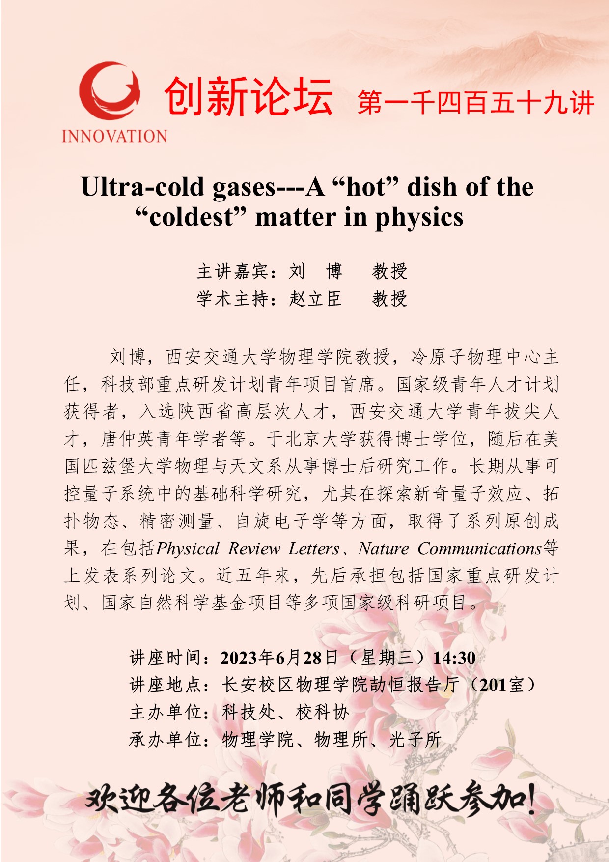 刘 博 教授 乐动网页版登录入口创新论坛第一千四百五十九讲:Ultra-cold gases---A “hot” dish of the “coldest” matter in physics 讲座时间 2023年6月28日(星期三)14:30 讲座地点 长安校区物理学院劼恒报告厅(201室) 讲座人介绍 刘 博 教授 讲座内容
