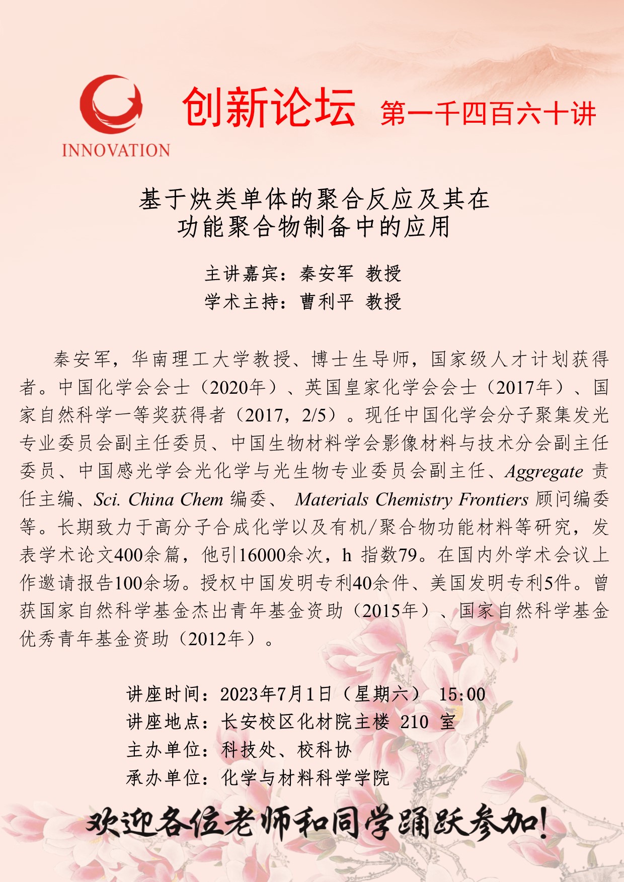 秦安军 教授 乐动网页版登录入口创新论坛第一千四百六十讲:基于炔类单体的聚合反应及其在功能聚合物制备中的应用 讲座时间 2023年7月1日(星期六) 15:00 讲座地点 长安校区化材院主楼 210 室 讲座人介绍 秦安军 教授 讲座内容