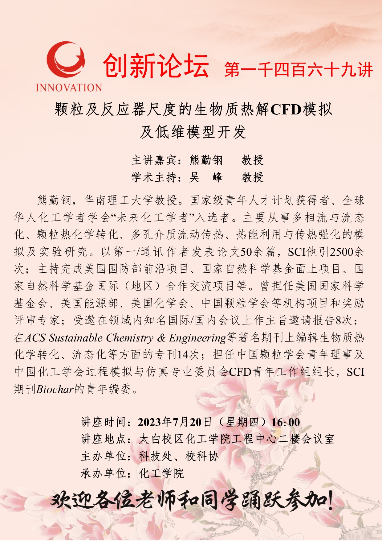 熊勤钢 教授 乐动网页版登录入口创新论坛第一千四百六十九讲:颗粒及反应器尺度的生物质热解CFD模拟 讲座时间 2023年7月20日(星期四)16:00 讲座地点 太白校区化工学院工程中心二楼会议室 讲座人介绍 熊勤钢 教授 讲座内容