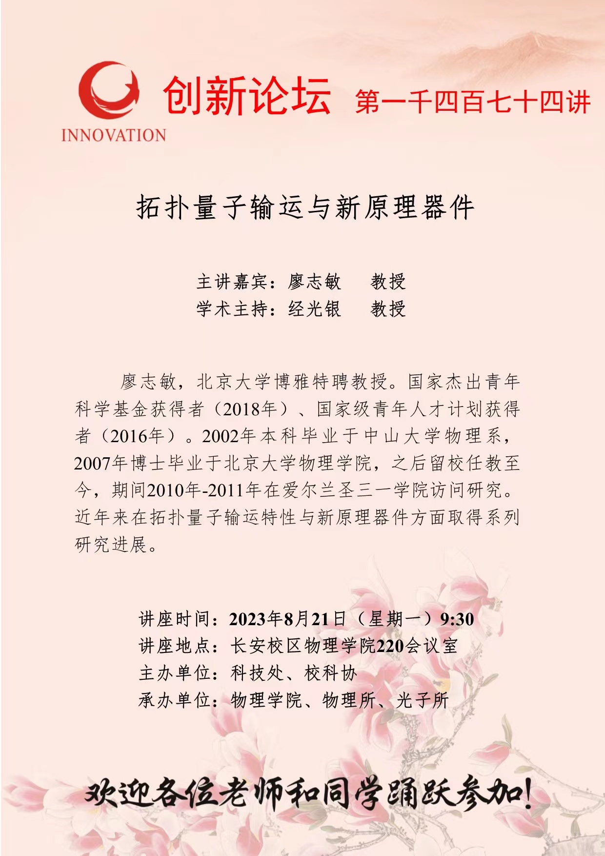 廖志敏 教授 乐动网页版登录入口创新论坛第一千四百七十四讲:拓扑量子输运与新原理器件 讲座时间 2023年8月21日(星期一)9:30 讲座地点 长安校区物理学院220会议室 讲座人介绍 廖志敏 教授 讲座内容