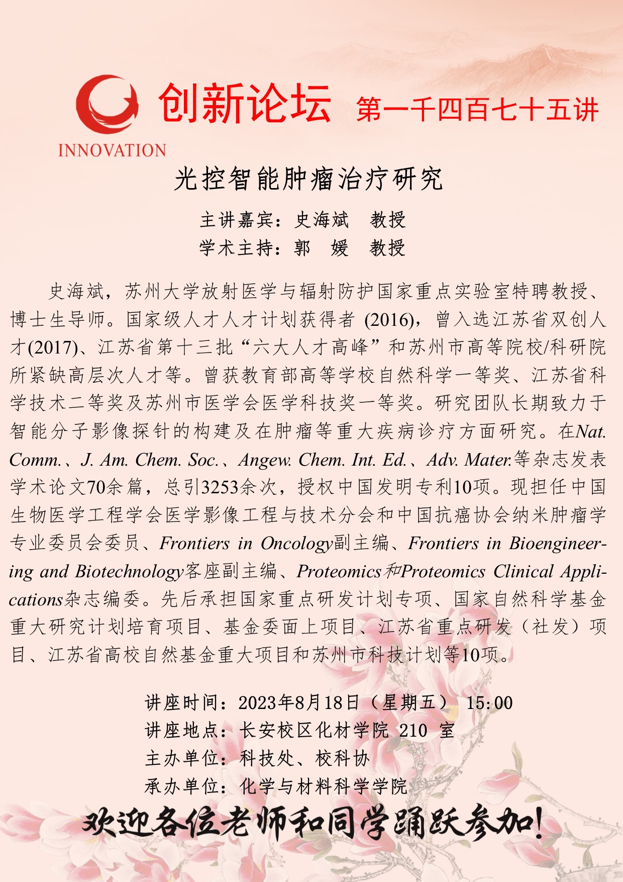史海斌 教授 乐动网页版登录入口创新论坛第一千四百七十五讲:光控智能肿瘤治疗研究 讲座时间 2023年8月18日(星期五) 15:00 讲座地点 长安校区化材学院 210 室 讲座人介绍 史海斌 教授 讲座内容