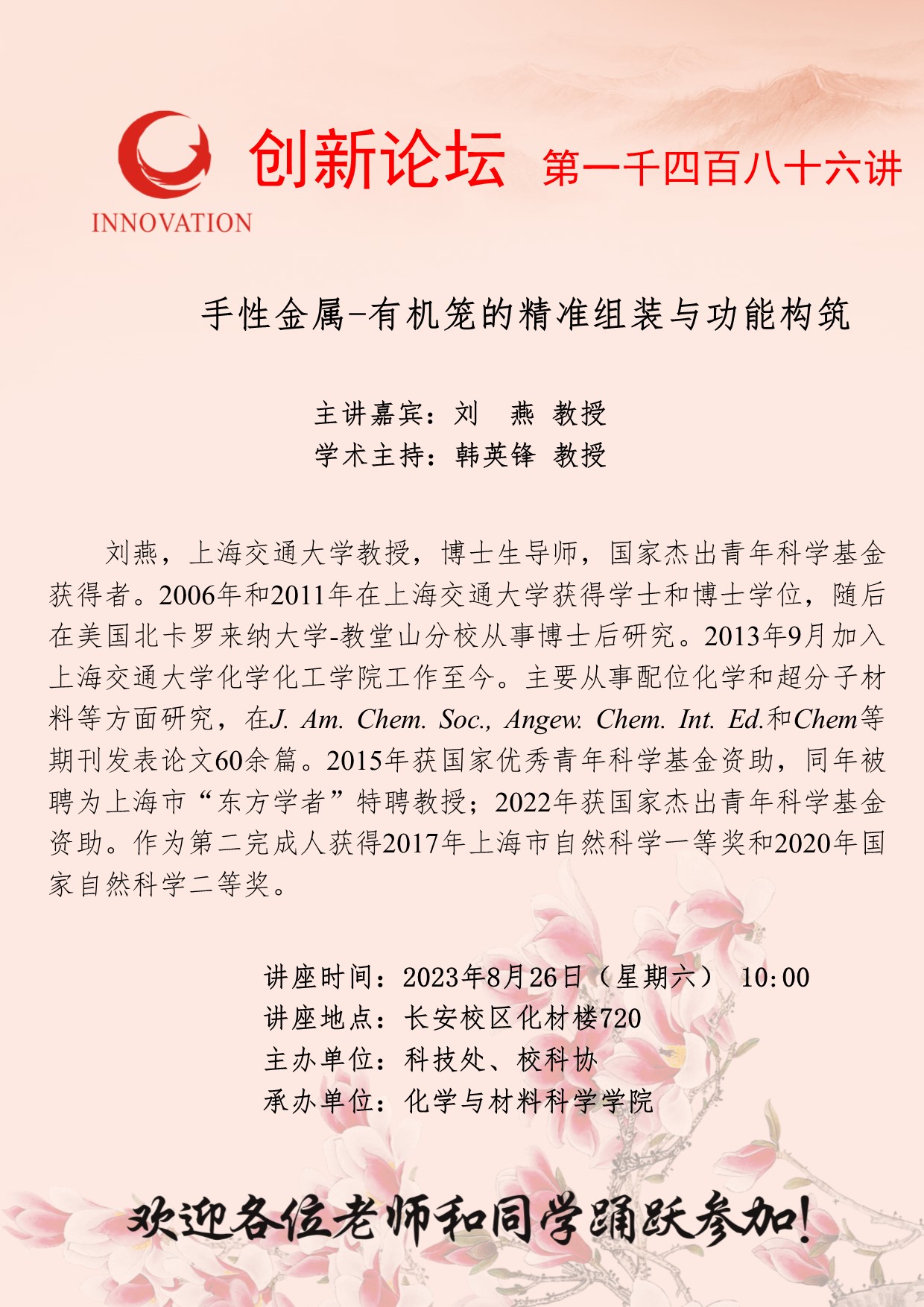 刘燕 教授 乐动网页版登录入口创新论坛第一千四百八十六讲:手性金属-有机笼的精准组装与功能构筑 讲座时间 2023年8月26日(星期六) 10:00 讲座地点 长安校区化材楼720 讲座人介绍 刘燕 教授 讲座内容