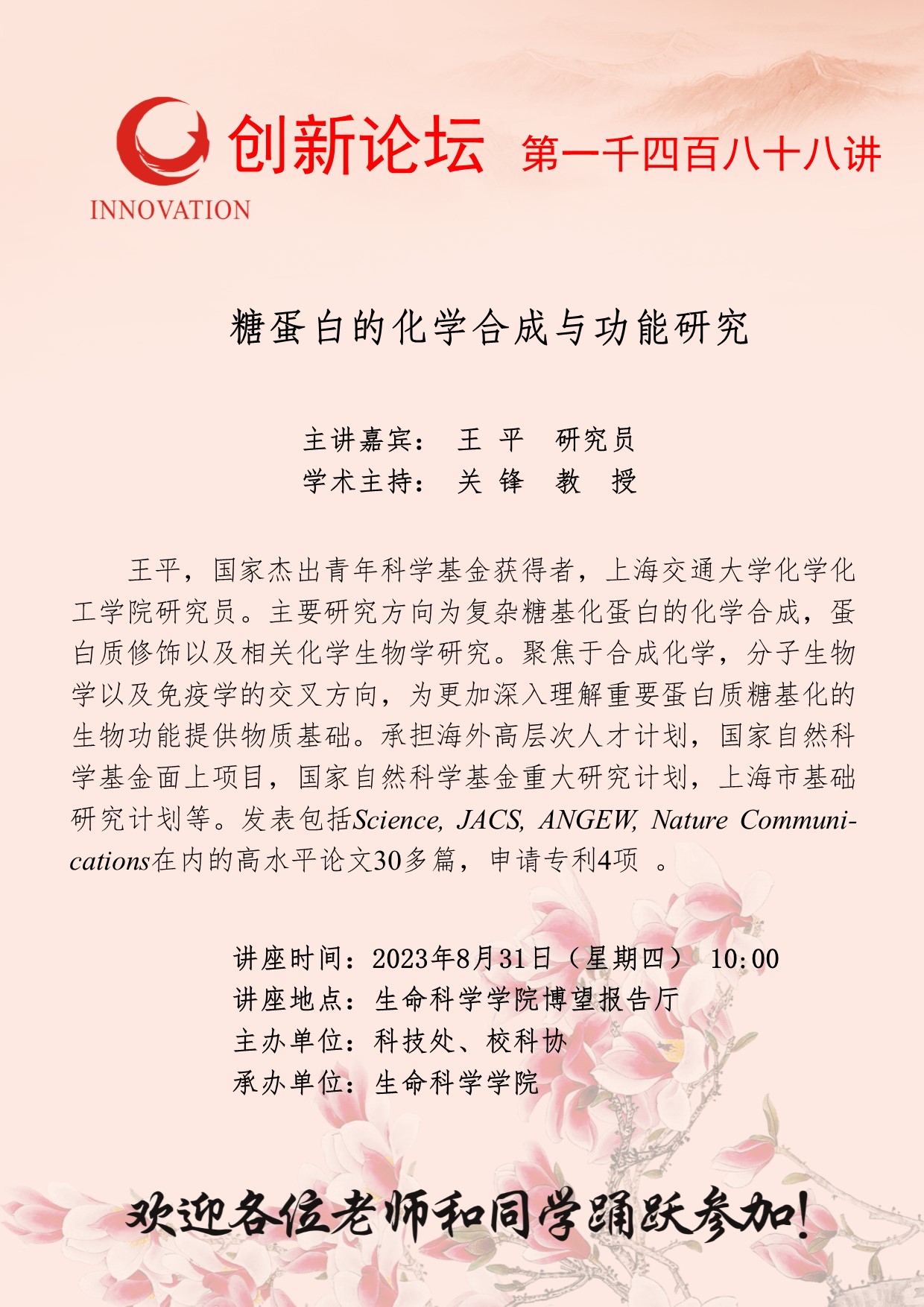 王平 研究员 乐动网页版登录入口创新论坛第一千四百八十八讲:糖蛋白的化学合成与功能研究 讲座时间 2023年8月31日(星期四) 10:00 讲座地点 生命科学学院博望报告厅 讲座人介绍 王平 研究员 讲座内容
