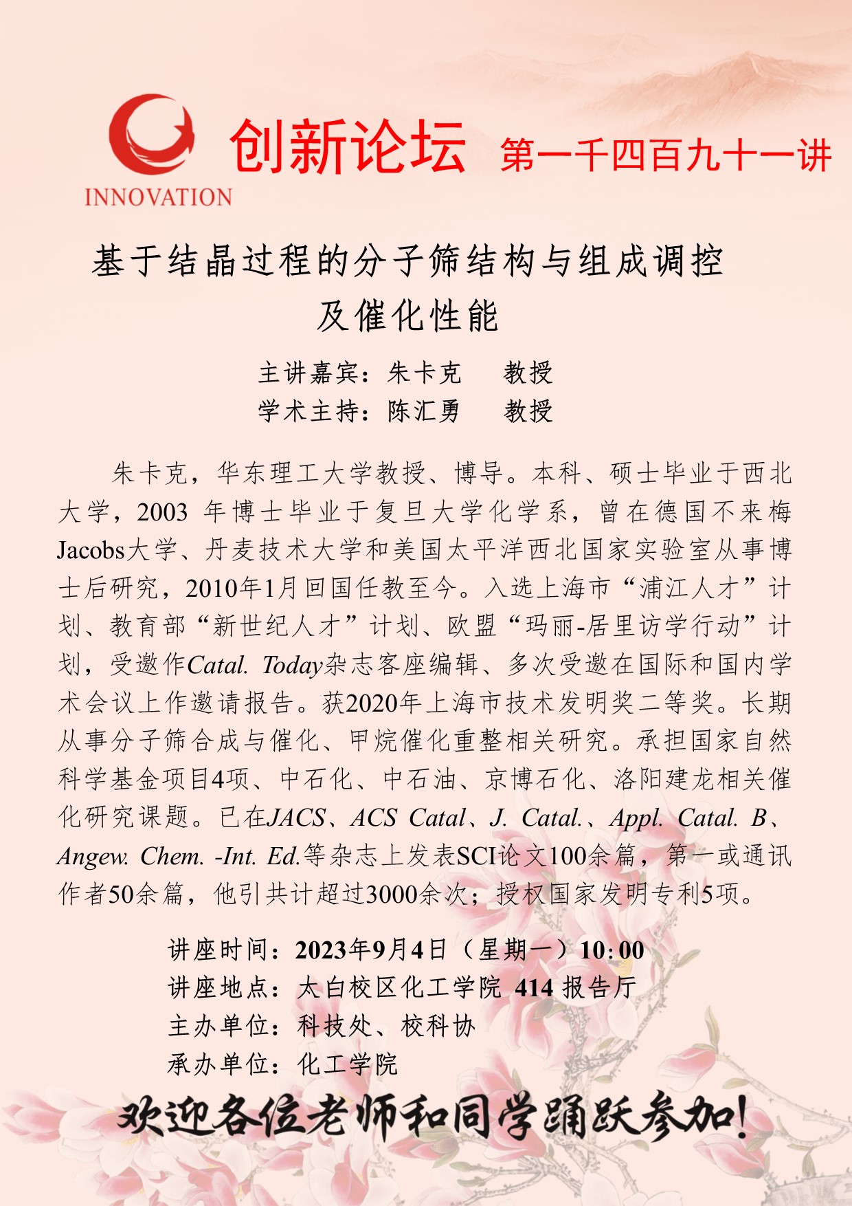 朱卡克 教授 乐动网页版登录入口创新论坛第一千四百九十一讲:基于结晶过程的分子筛结构与组成调控及催化性能 讲座时间 2023年9月4日(星期一)10:00 讲座地点 太白校区化工学院414报告厅 讲座人介绍 朱卡克 教授 讲座内容