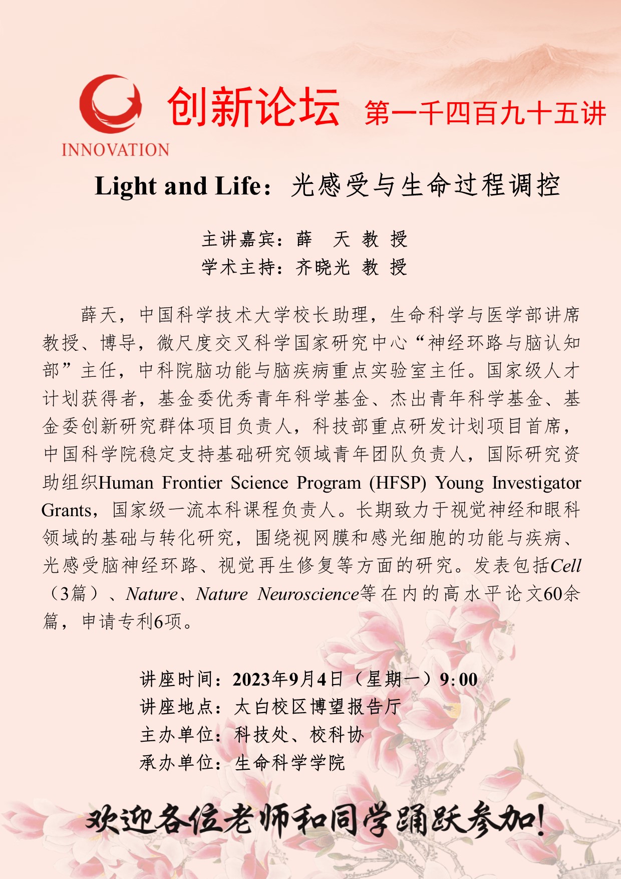 薛天 教授 乐动网页版登录入口创新论坛第一千四百九十五讲:Light and Life:光感受与生命过程调控 讲座时间 2023年9月4日(星期一)9:00 讲座地点 太白校区博望报告厅 讲座人介绍 薛天 教授 讲座内容