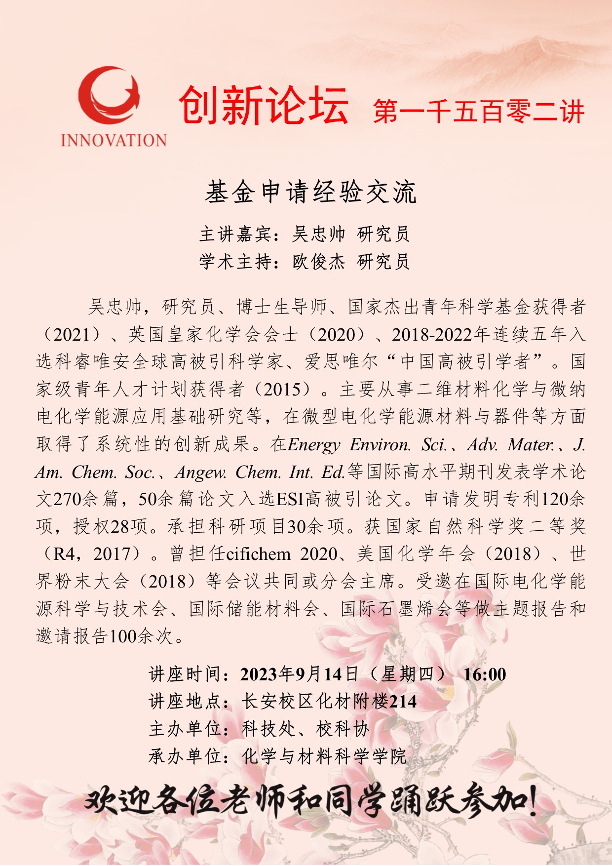 吴忠帅 研究员 乐动网页版登录入口创新论坛第一千五百零二讲: 基金申请经验交流 讲座时间 2023年9月14日(星期四) 16:00 讲座地点 长安校区化材附楼214 讲座人介绍 吴忠帅 研究员 讲座内容