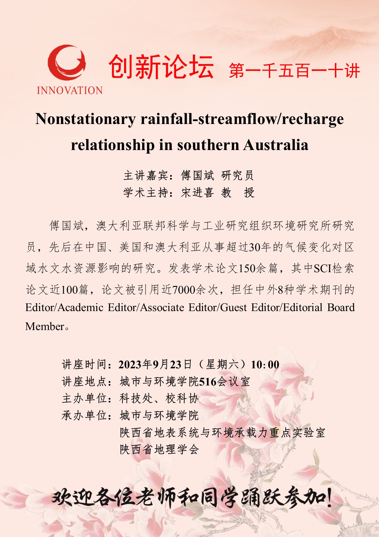 傅国斌 研究员 乐动网页版登录入口创新论坛第一千五百一十讲:Nonstationary rainfall‐streamflow/recharge relationship in southern Australia 讲座时间 2023年9月23日(星期六)10:00 讲座地点 城市与环境学院516会议室 讲座人介绍 傅国斌 研究员 讲座内容
