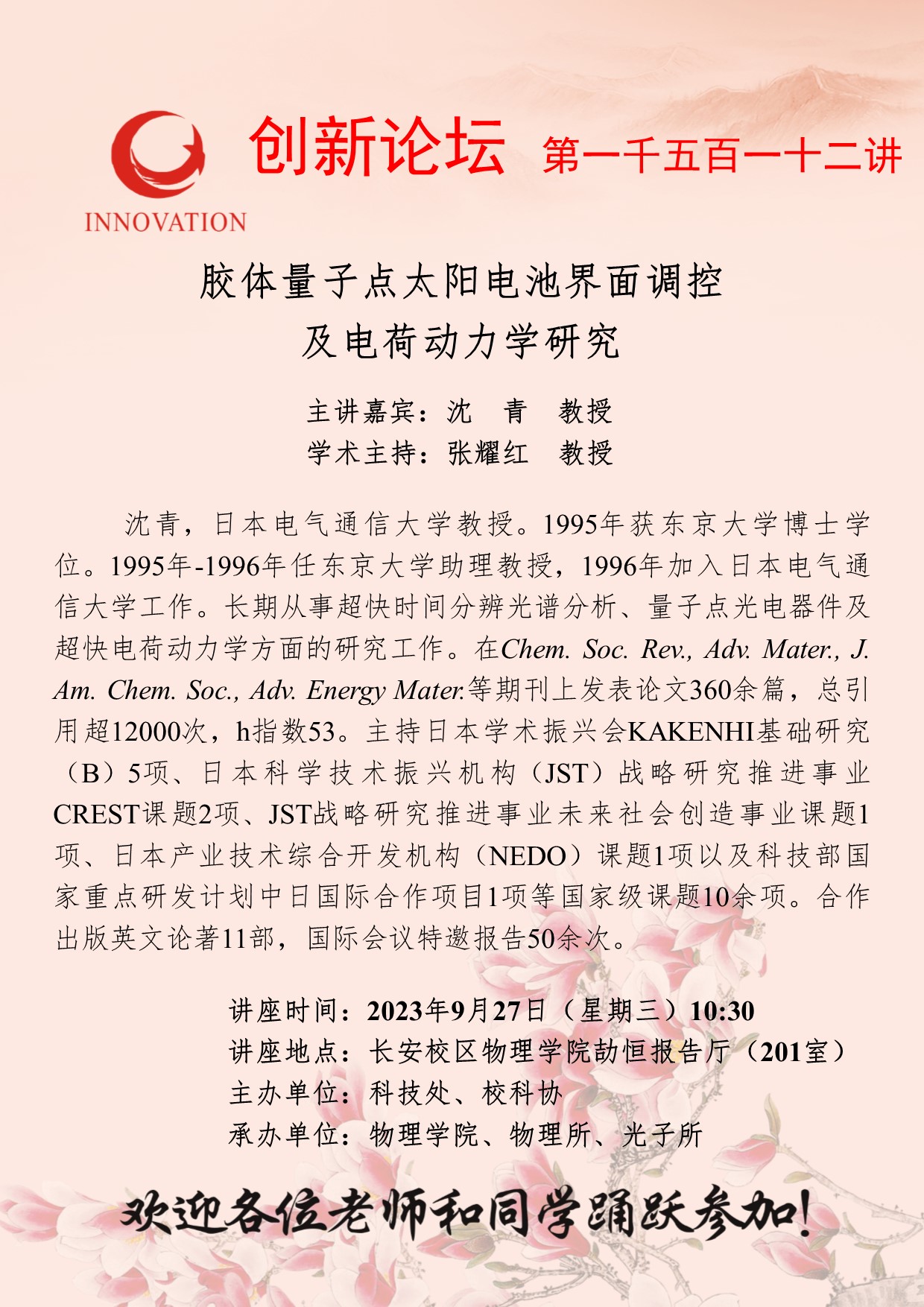 沈青 教授 乐动网页版登录入口创新论坛第一千五百一十二讲:胶体量子点太阳电池界面调控及电荷动力学研究 讲座时间 2023年9月27日(星期三)10:30 讲座地点 长安校区物理学院劼恒报告厅(201室) 讲座人介绍 沈青 教授 讲座内容