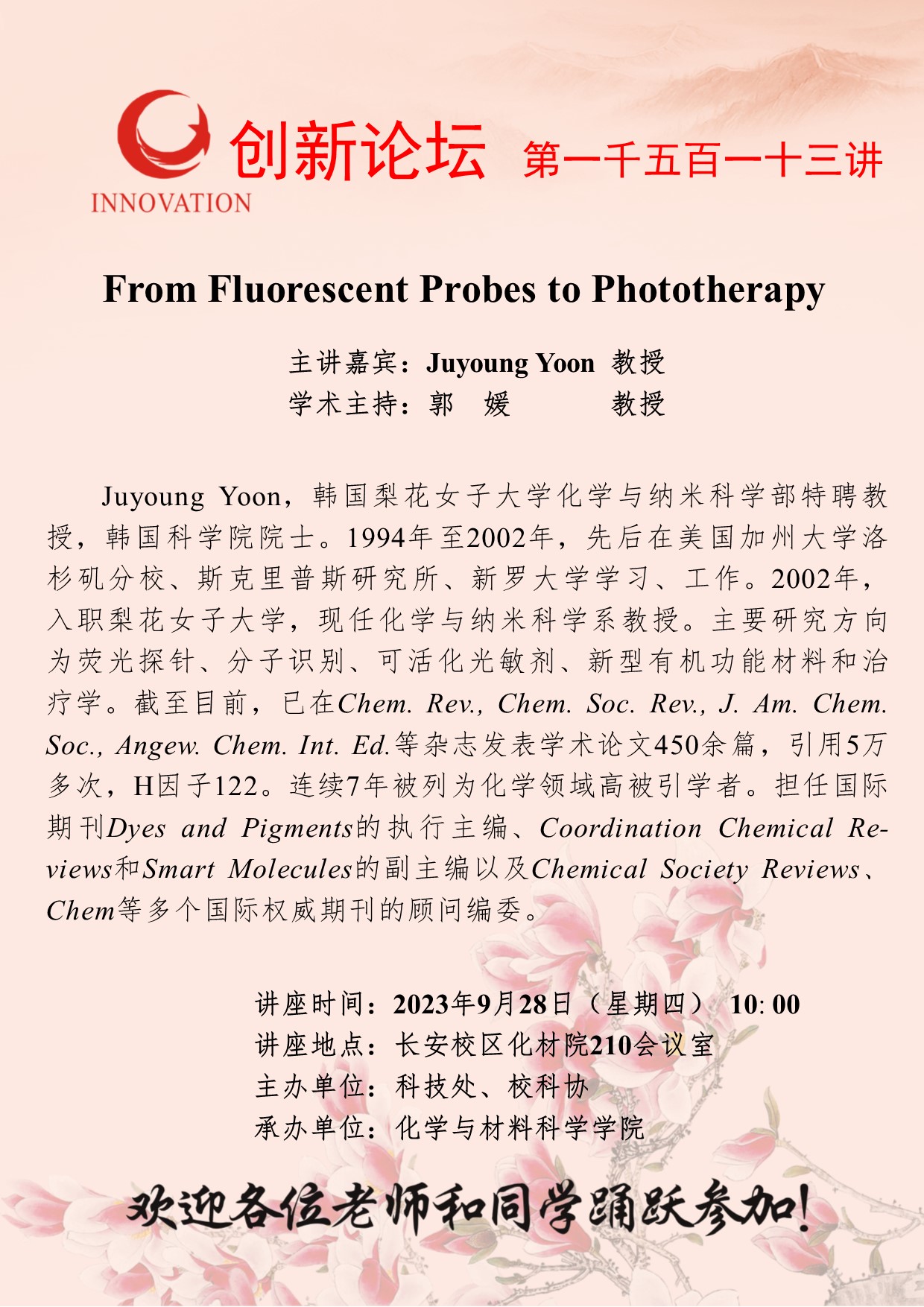 Juyoung Yoon 教授 乐动网页版登录入口创新论坛第一千五百一十三讲:From Fluorescent Probes to Phototherapy 讲座时间 2023年9月28日(星期四) 10: 00 讲座地点 长安校区化材院210会议室 讲座人介绍 Juyoung Yoon 教授 讲座内容