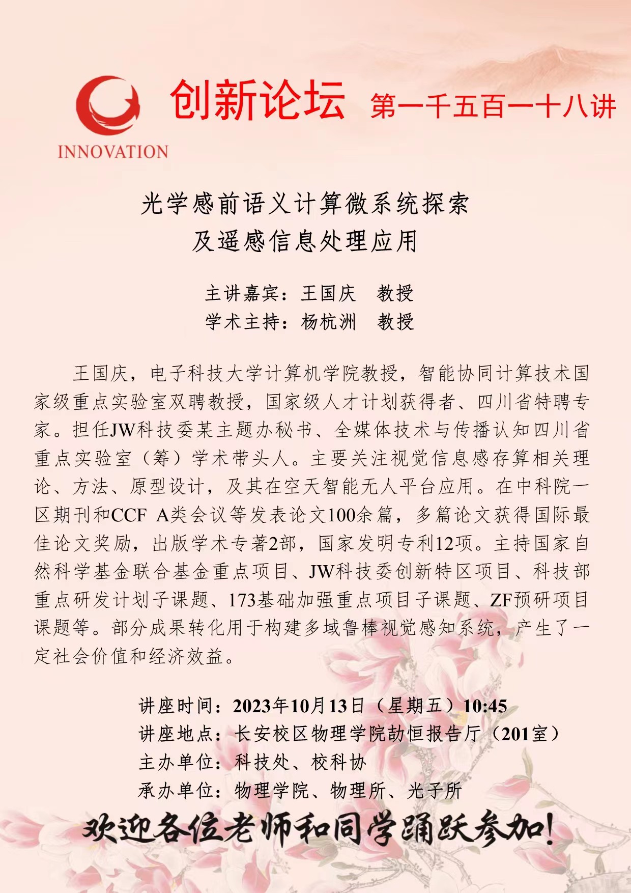 王国庆 教授 乐动网页版登录入口创新论坛第一千五百一十八讲:光学感前语义计算微系统探索及遥感信息处理应用 讲座时间 2023年10月13日(星期五)10:45 讲座地点 长安校区物理学院劼恒报告厅(201室) 讲座人介绍 王国庆 教授 讲座内容