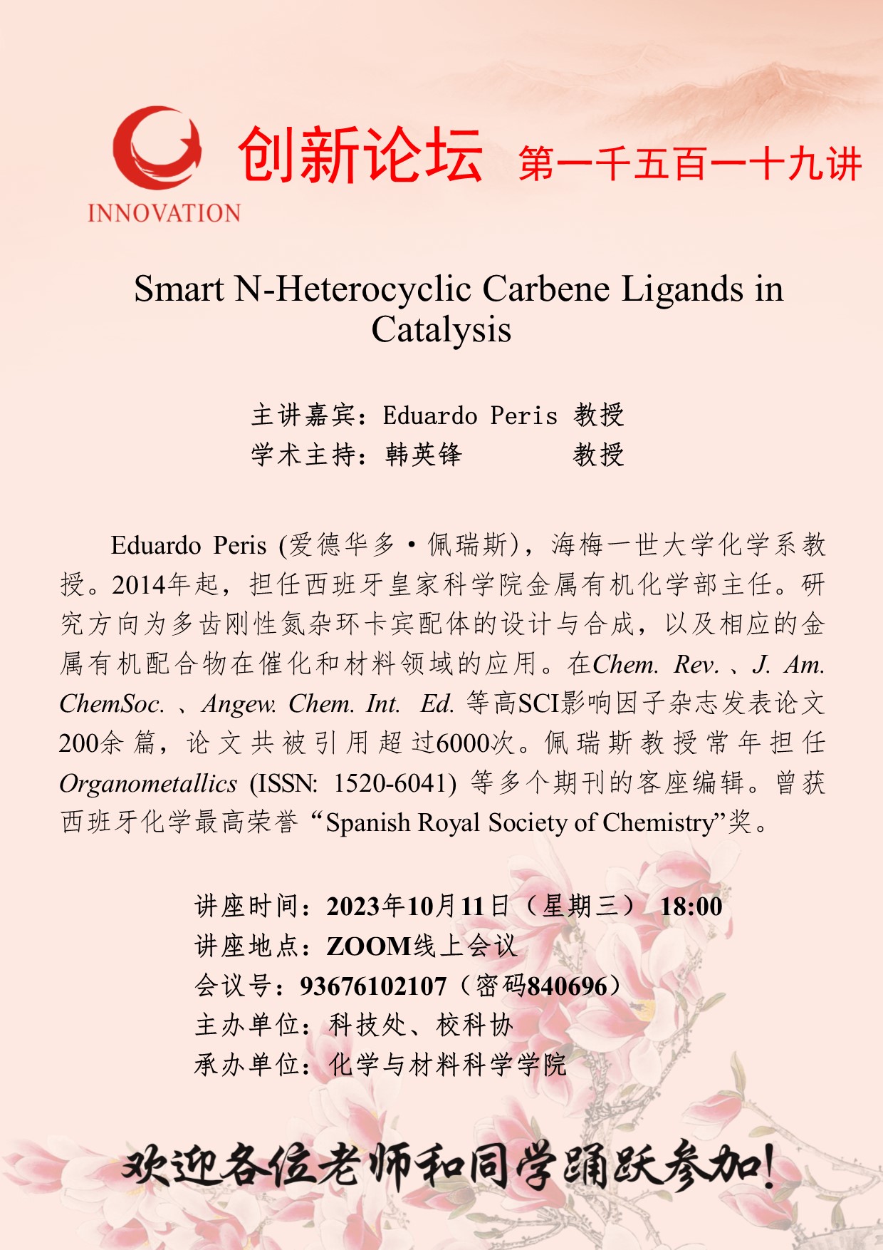 Eduardo Peris 教授 乐动网页版登录入口创新论坛第一千五百一十九讲: Smart N-Heterocyclic Carbene Ligands in Catalysis 讲座时间 2023年10月11日(星期三) 18:00 讲座地点 ZOOM线上会议 讲座人介绍 Eduardo Peris 教授 讲座内容