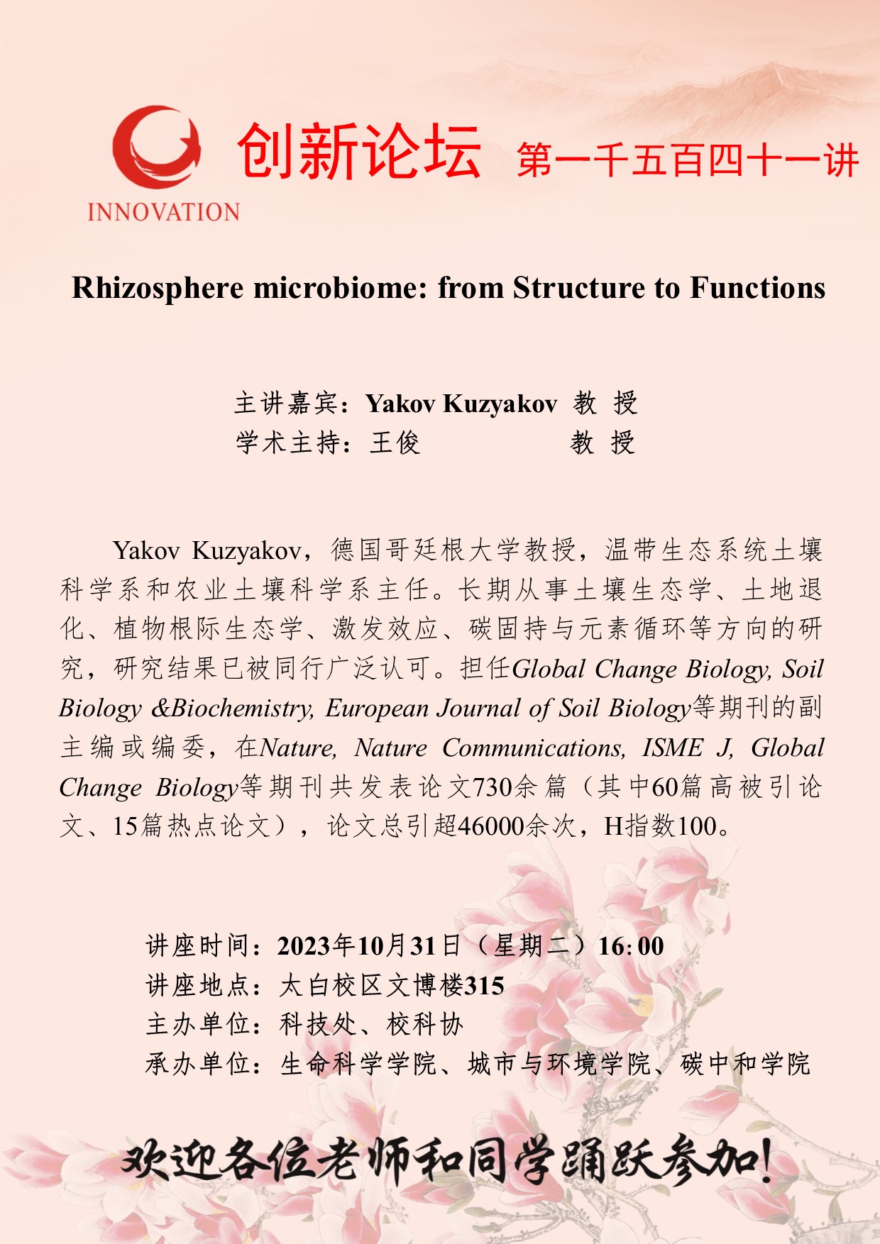 Yakov Kuzyakov 教 授 乐动网页版登录入口创新论坛第一千五百四十一讲:Rhizosphere microbiome: from Structure to Functions 讲座时间 2023年10月31日(星期二)16:00 讲座地点 太白校区文博楼315 讲座人介绍 Yakov Kuzyakov 教 授 讲座内容