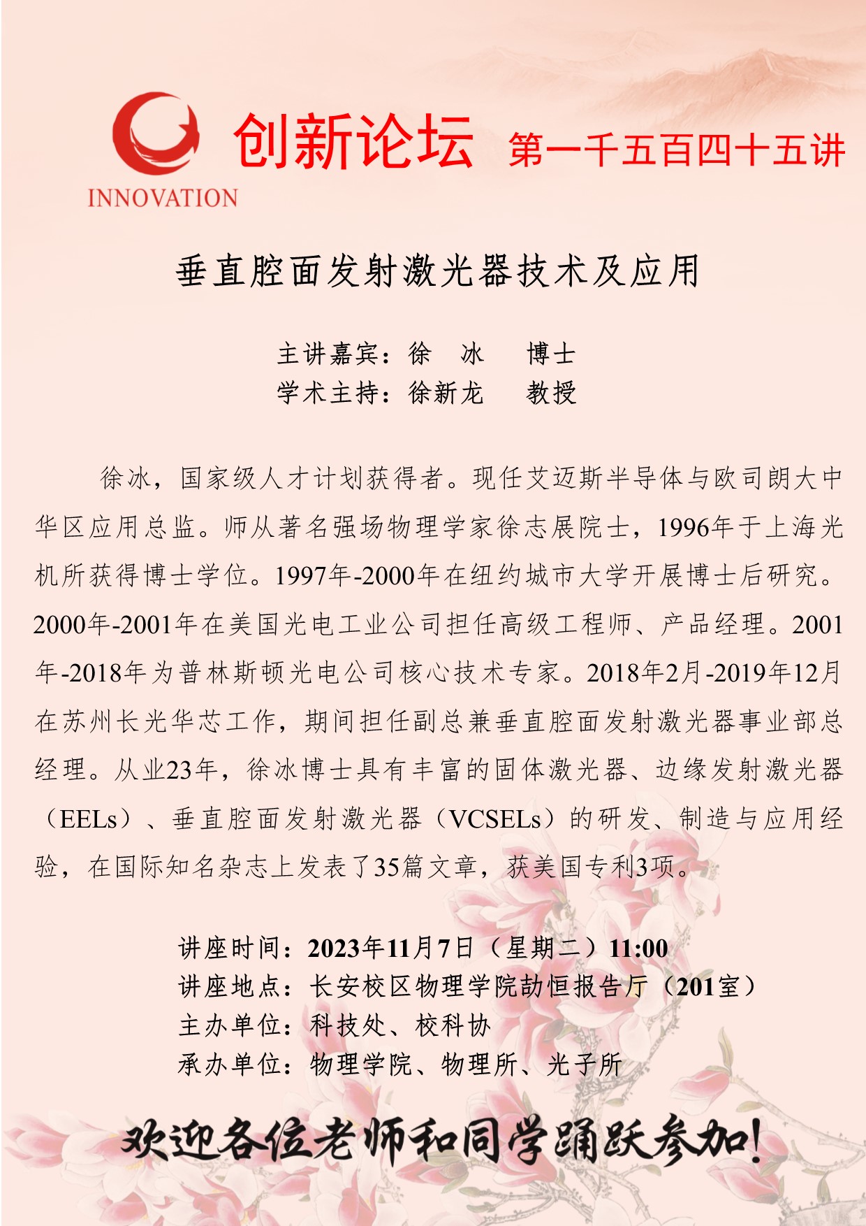 徐冰 博士 乐动网页版登录入口创新论坛第一千五百四十五讲:垂直腔面发射激光器技术及应用 讲座时间 2023年11月7日(星期二)11:00 讲座地点 长安校区物理学院劼恒报告厅(201室) 讲座人介绍 徐冰 博士 讲座内容