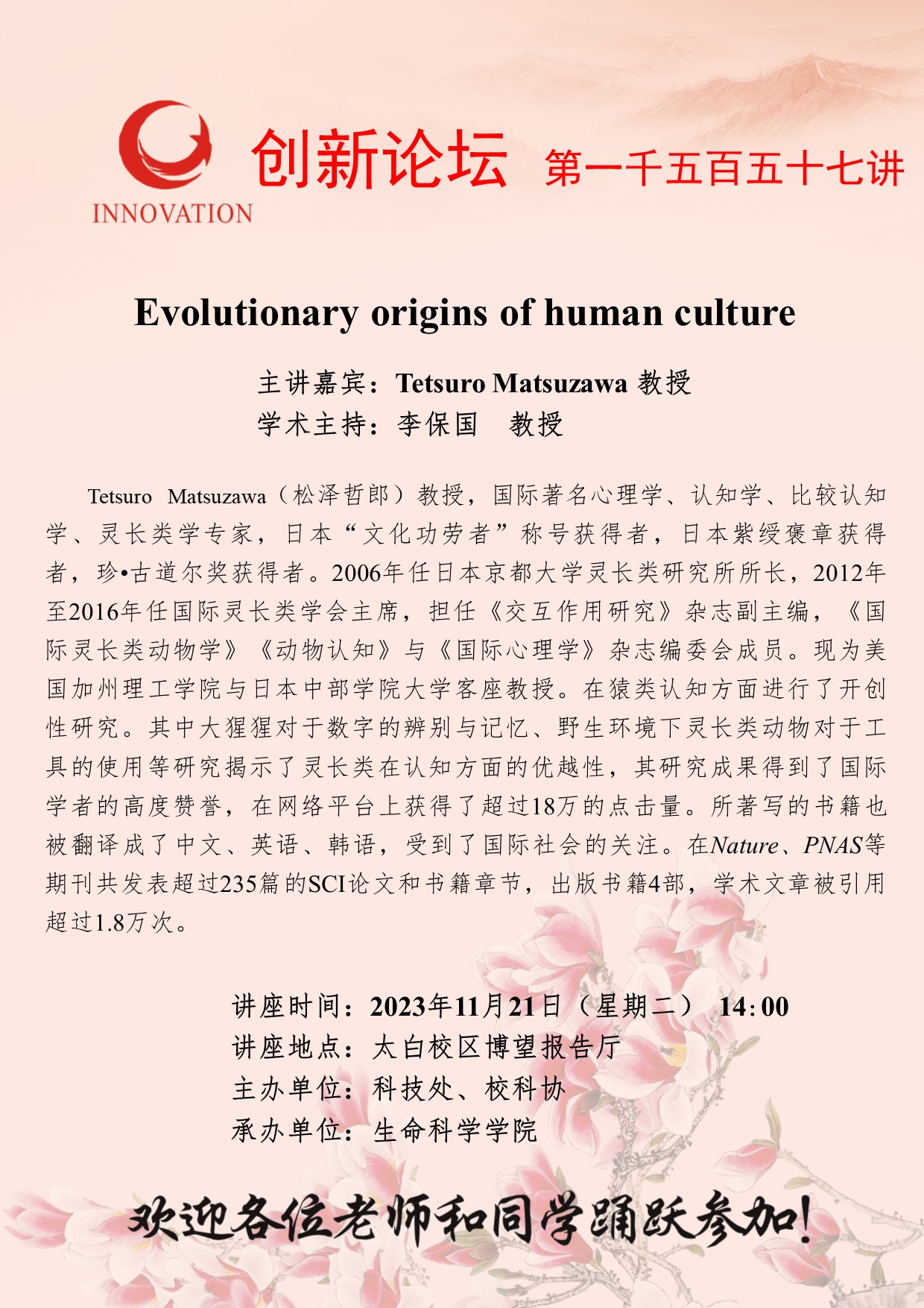 Tetsuro Matsuzawa 教授 乐动网页版登录入口创新论坛第一千五百五十七讲:Evolutionary origins of human culture 讲座时间 2023年11月21日(星期二) 14:00 讲座地点 太白校区博望报告厅 讲座人介绍 Tetsuro Matsuzawa 教授 讲座内容