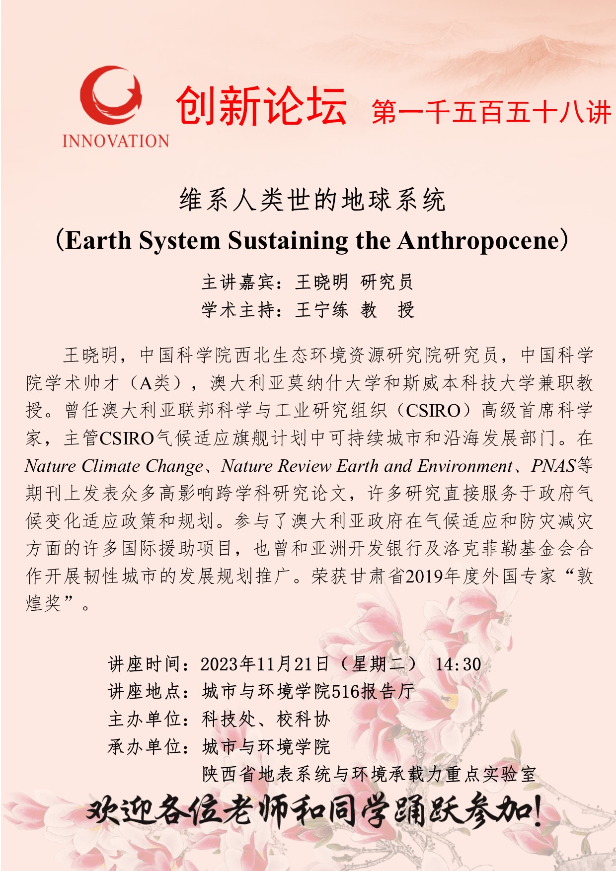 王晓明 研究员 乐动网页版登录入口创新论坛第一千五百五十八讲:维系人类世的地球系统 讲座时间 2023年11月21日(星期二) 14:30 讲座地点 城市与环境学院516报告厅 讲座人介绍 王晓明 研究员 讲座内容