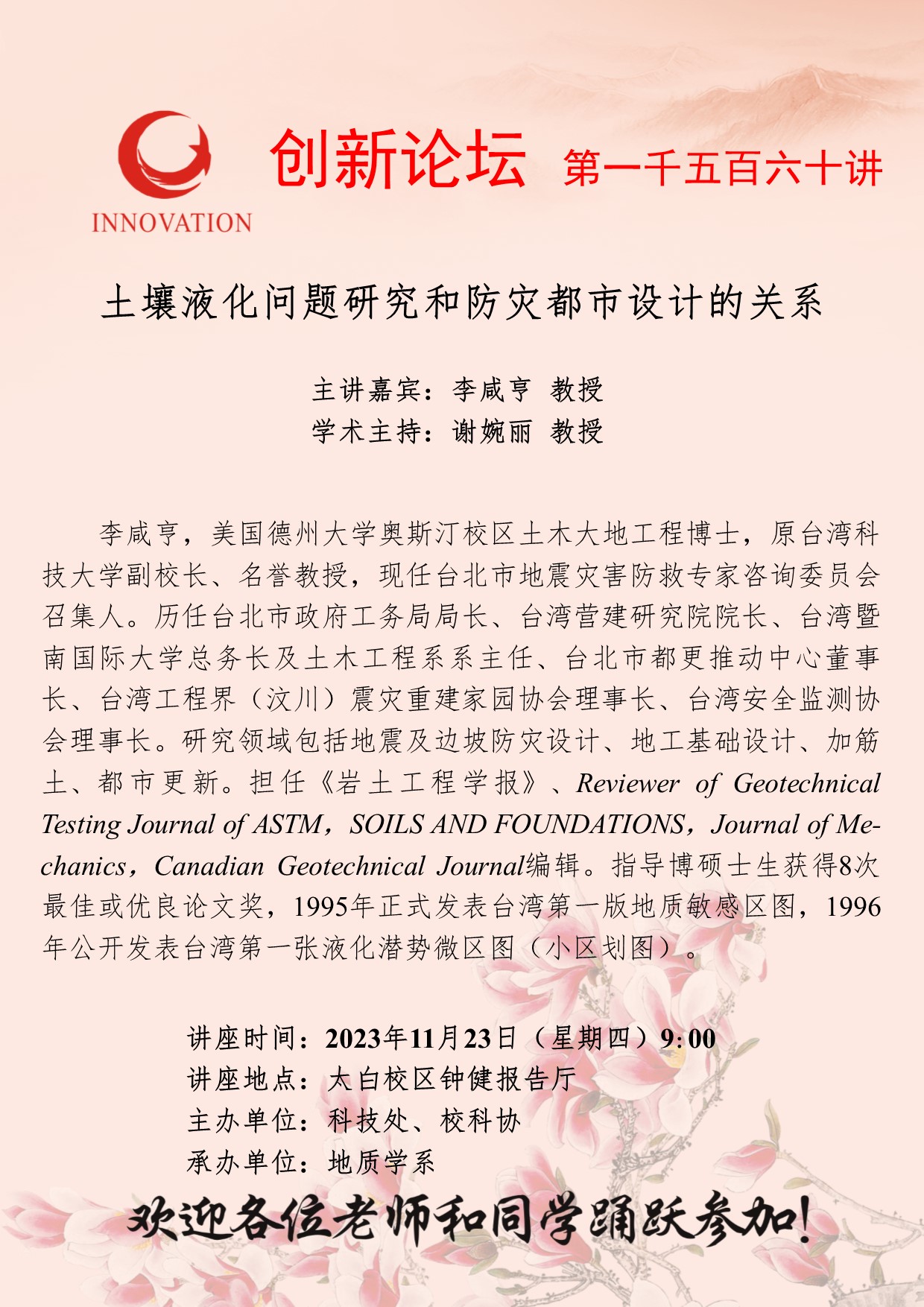 李咸亨 教授 乐动网页版登录入口创新论坛第一千五百六十讲:土壤液化问题研究和防灾都市设计的关系 讲座时间 2023年11月23日(星期四)9:00 讲座地点 太白校区钟健报告厅 讲座人介绍 李咸亨 教授 讲座内容