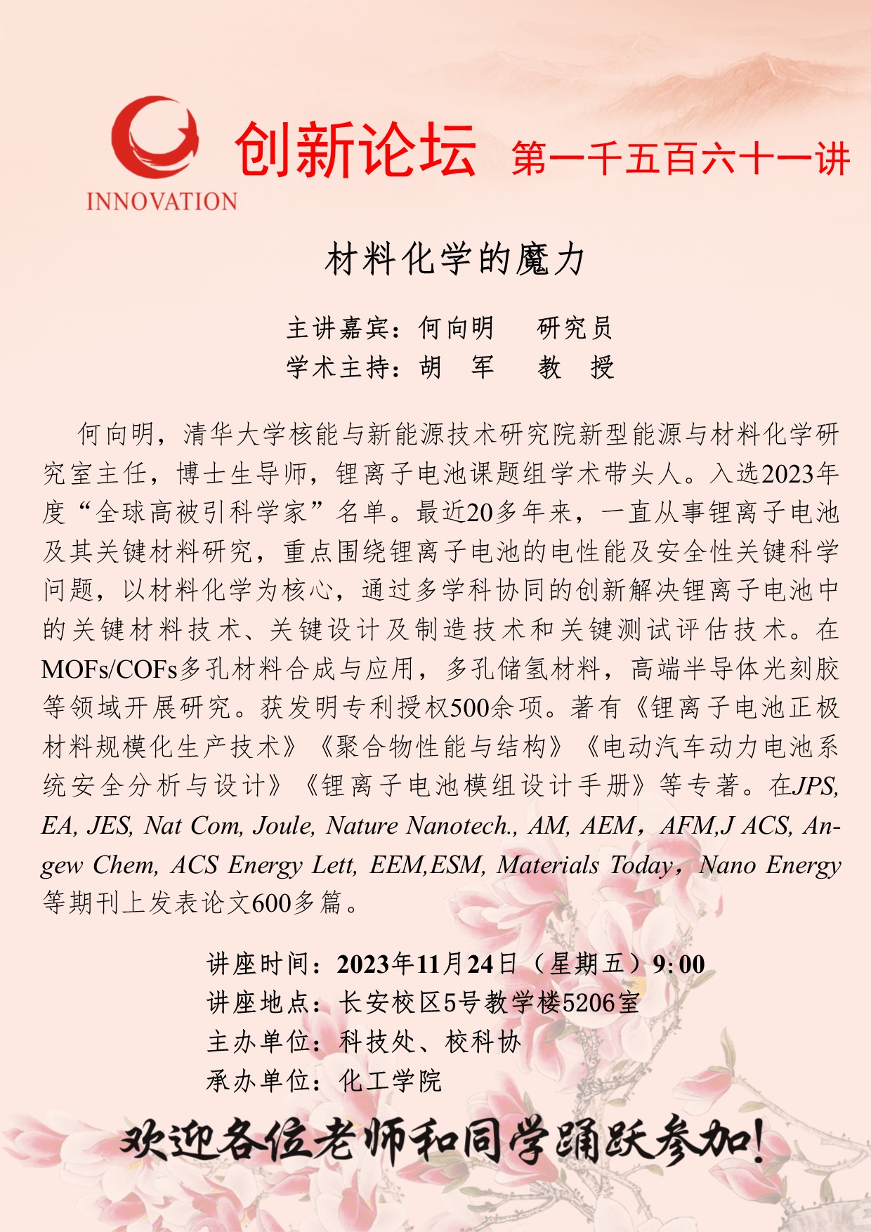 何向明 研究员 乐动网页版登录入口创新论坛第一千五百六十一讲:材料化学的魔力 讲座时间 2023年11月24日(星期五)9:00 讲座地点 长安校区5号教学楼5206室 讲座人介绍 何向明 研究员 讲座内容