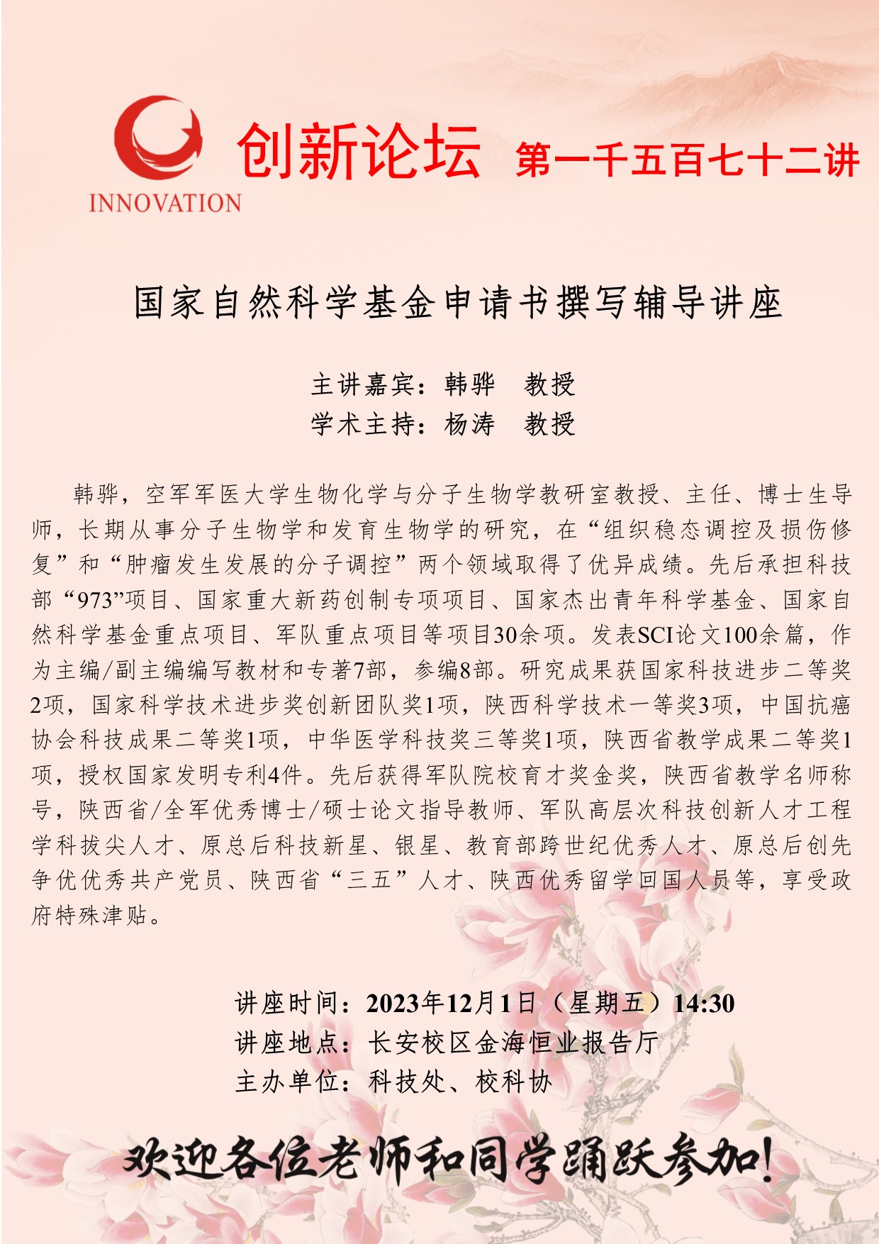 韩骅 教授 乐动网页版登录入口创新论坛第一千五百七十二讲:国家自然科学基金申请书撰写辅导讲座 讲座时间 2023年12月1日(星期五)14:30 讲座地点 长安校区金海恒业报告厅 讲座人介绍 韩骅 教授 讲座内容