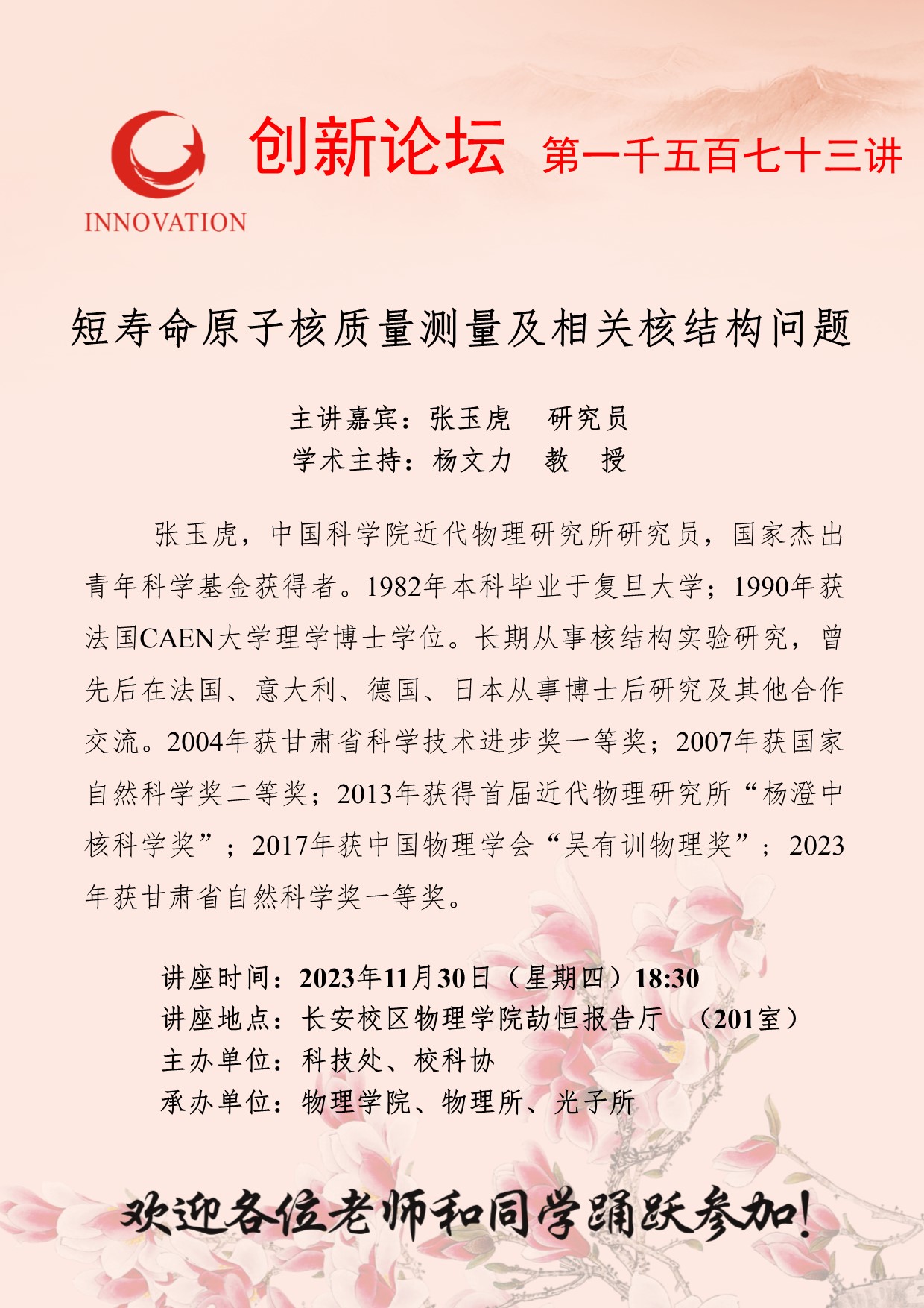 张玉虎 研究员 乐动网页版登录入口创新论坛第一千五百七十三讲:短寿命原子核质量测量及相关核结构问题 讲座时间 2023年11月30日(星期四)18:30 讲座地点 长安校区物理学院劼恒报告厅 (201室) 讲座人介绍 张玉虎 研究员 讲座内容