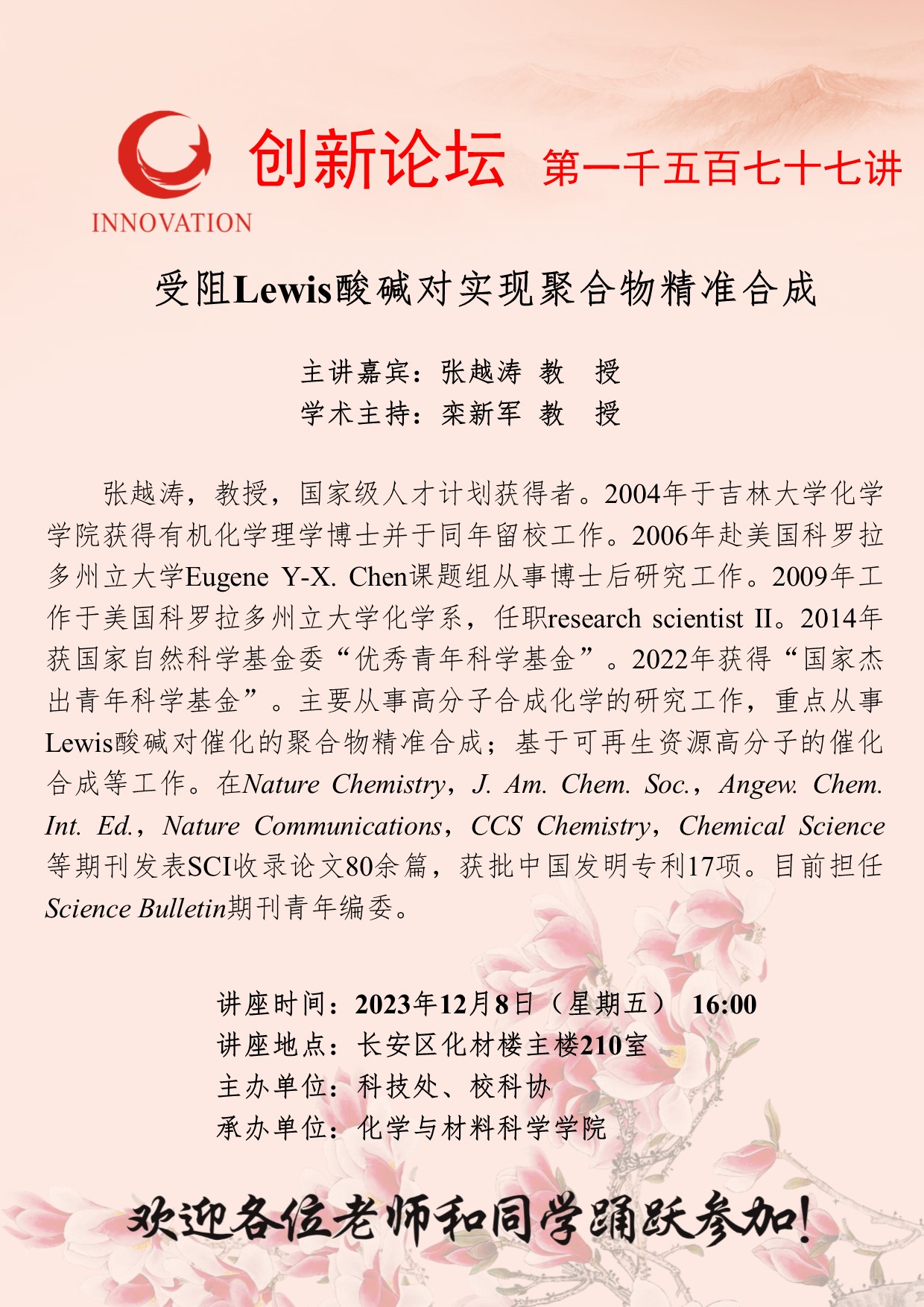 张越涛 教授 乐动网页版登录入口创新论坛第一千五百七十七讲:受阻Lewis酸碱对实现聚合物精准合成 讲座时间 2023年12月8日(星期五) 16:00 讲座地点 长安区化材楼主楼210室 讲座人介绍 张越涛 教授 讲座内容