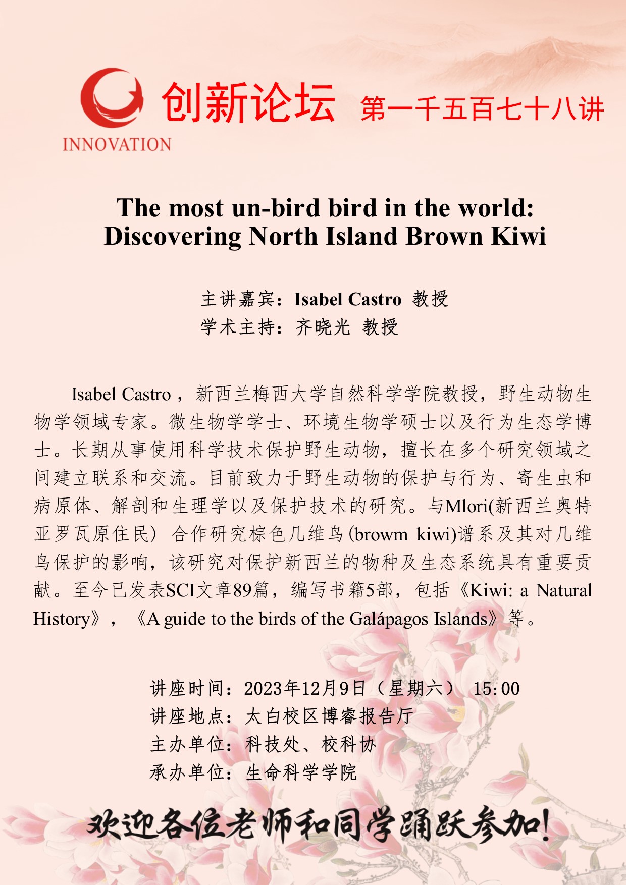 Isabel Castro 教授 乐动网页版登录入口创新论坛第一千五百七十八讲:The most un-bird bird in the world: Discovering North Island Brown Kiwi 讲座时间 2023年12月9日(星期六) 15:00 讲座地点 太白校区博睿报告厅 讲座人介绍 Isabel Castro 教授 讲座内容