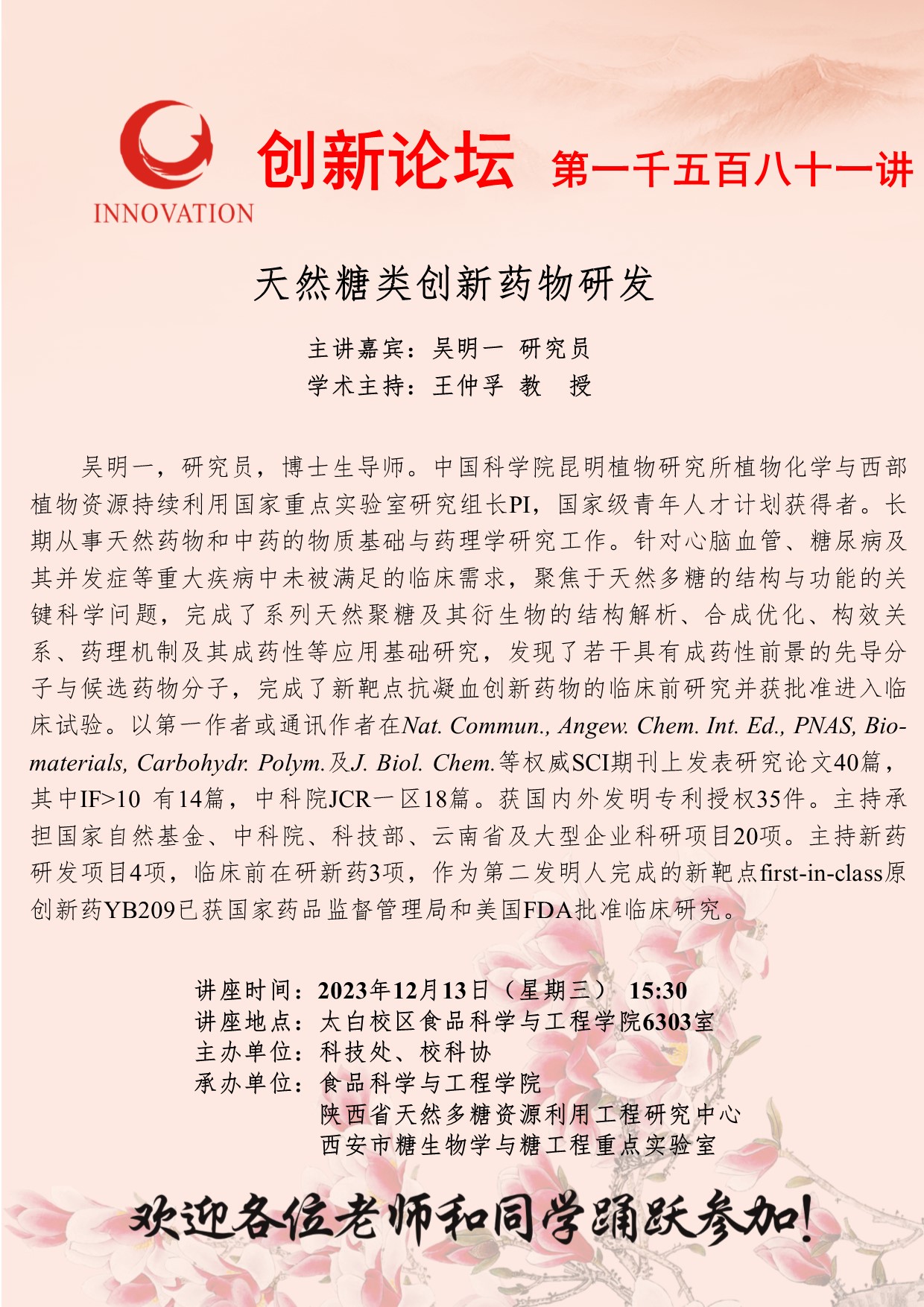 吴明一 研究员 乐动网页版登录入口创新论坛第一千五百八十一讲:天然糖类创新药物研发 讲座时间 2023年12月13日(星期三) 15:30 讲座地点 太白校区食品科学与工程学院6303室 讲座人介绍 吴明一 研究员 讲座内容
