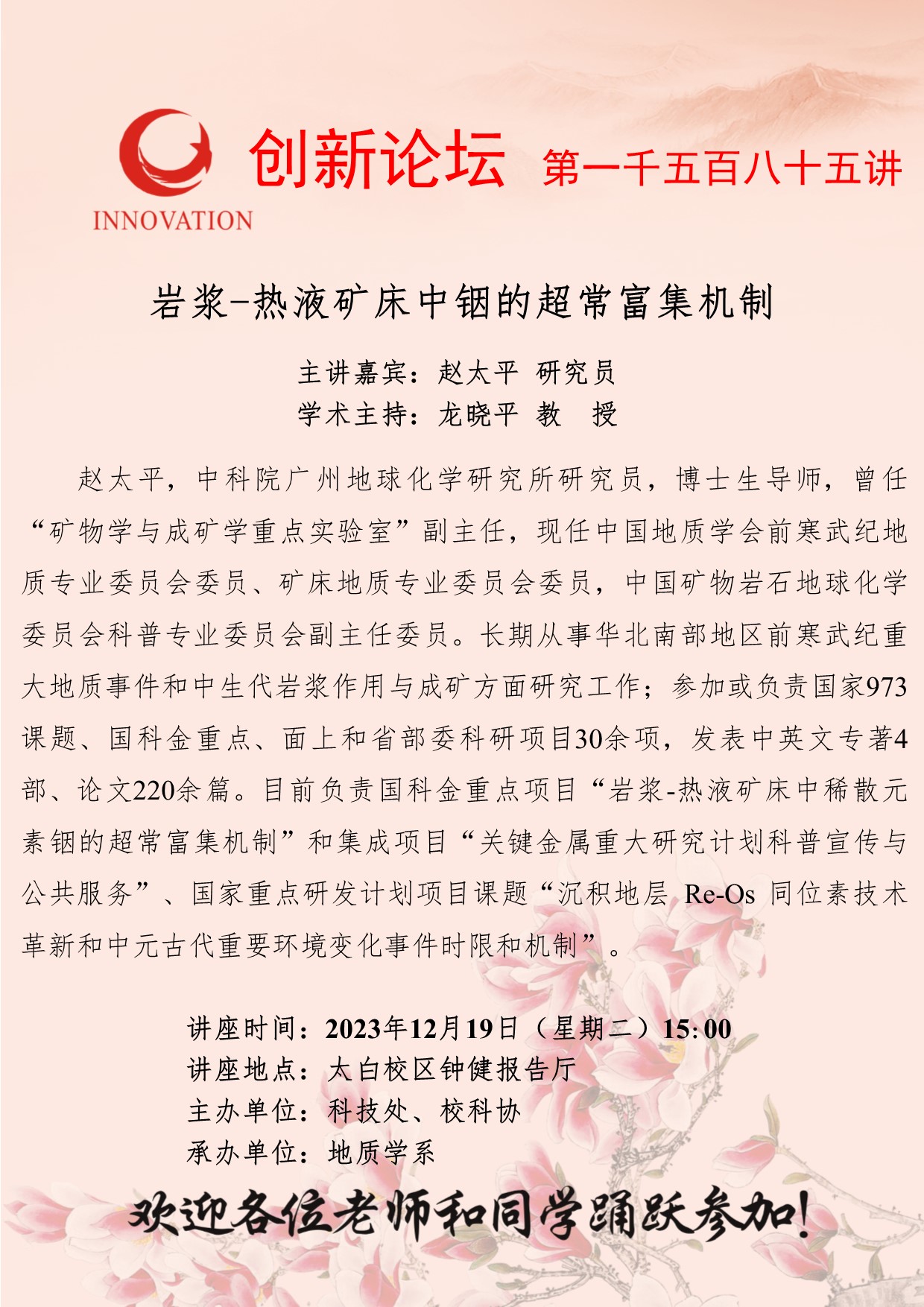 赵太平 研究员 乐动网页版登录入口创新论坛第一千五百八十五讲:岩浆-热液矿床中铟的超常富集机制 讲座时间 2023年12月19日(星期二)15:00 讲座地点 太白校区钟健报告厅 讲座人介绍 赵太平 研究员 讲座内容