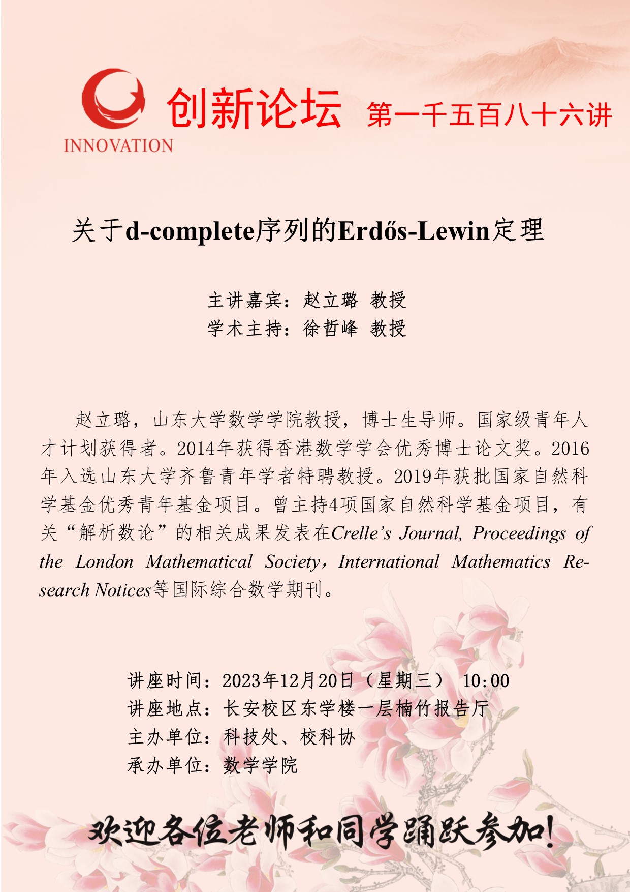 赵立璐 教授 乐动网页版登录入口创新论坛第一千五百八十六讲:关于d-complete序列的Erdős-Lewin定理 讲座时间 2023年12月20日(星期三) 10:00 讲座地点 长安校区东学楼一层楠竹报告厅 讲座人介绍 赵立璐 教授 讲座内容