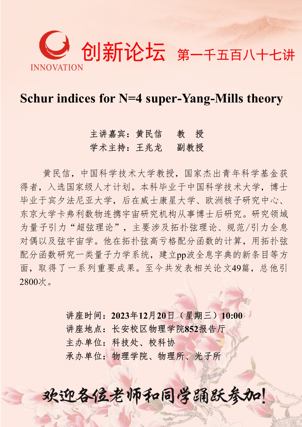 黄民信 教 授 乐动网页版登录入口创新论坛第一千五百八十七讲:Schur indices for N=4 super-Yang-Mills theory 讲座时间 2023年12月20日(星期三)10:00 讲座地点 长安校区物理学院852报告厅 讲座人介绍 黄民信 教 授 讲座内容