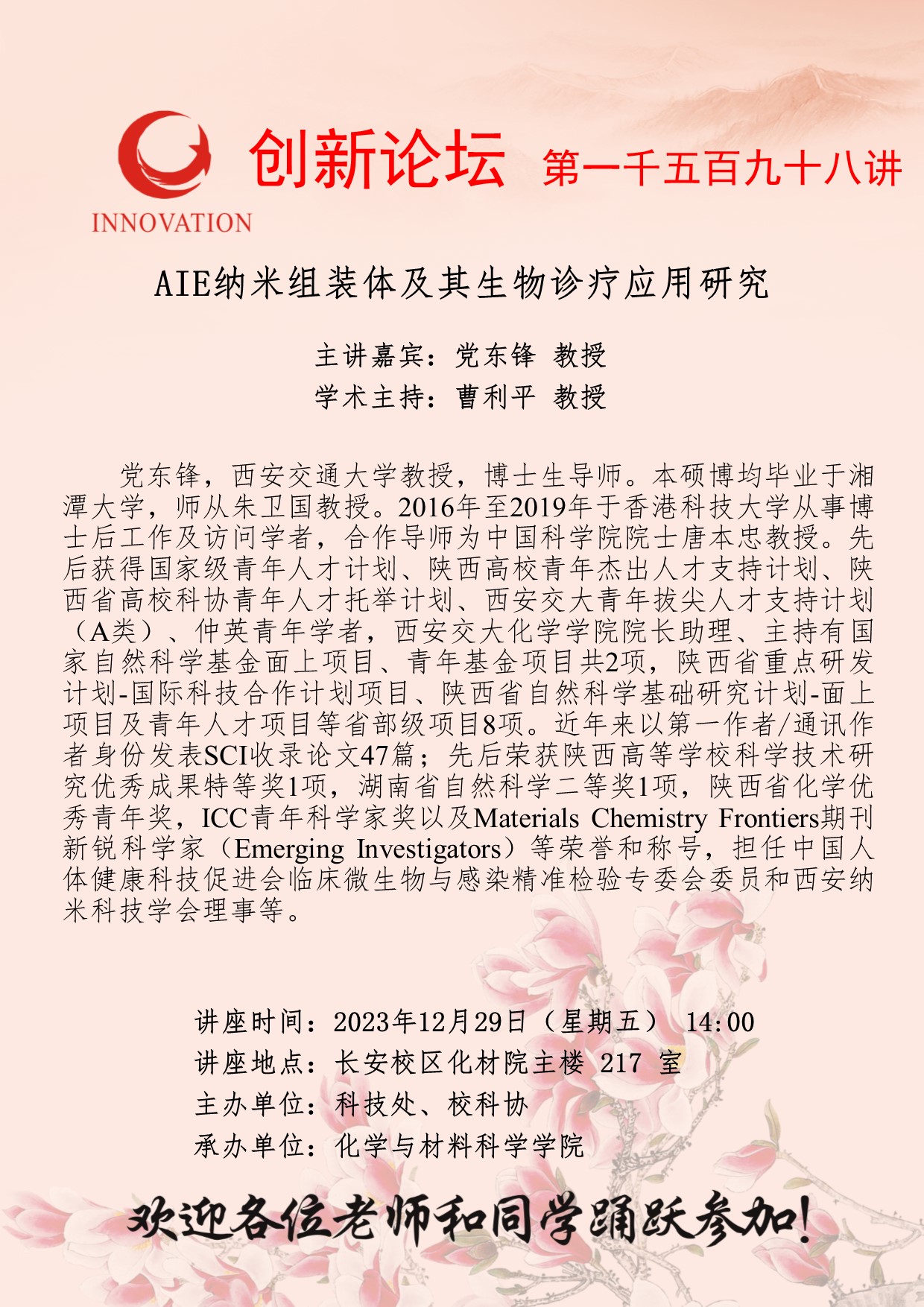 党东锋 教授 乐动网页版登录入口创新论坛第一千五百九十八讲:AIE纳米组装体及其生物诊疗应用研究 讲座时间 2023年12月29日(星期五) 14:00 讲座地点 长安校区化材院主楼217室 讲座人介绍 党东锋 教授 讲座内容