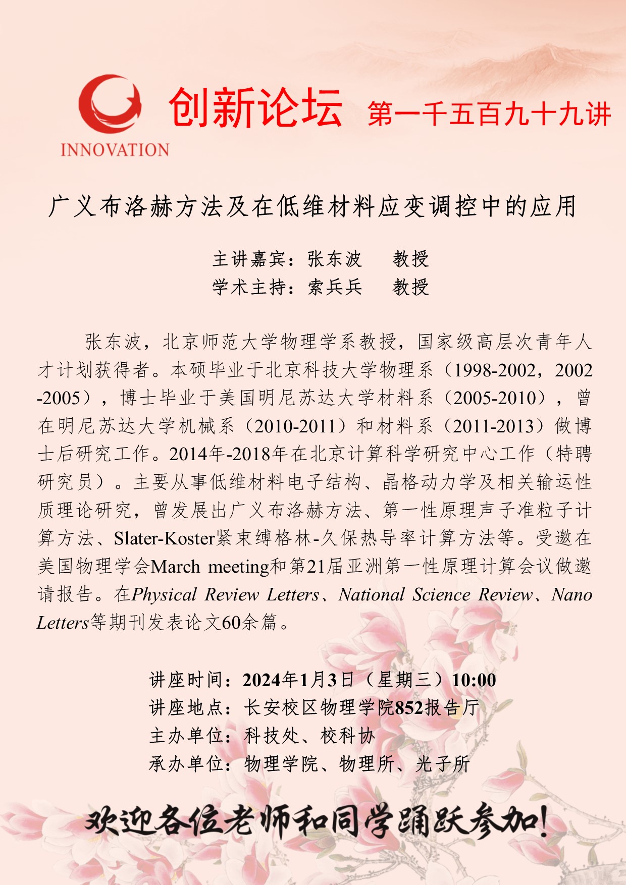 张东波 教授 乐动网页版登录入口创新论坛第一千五百九十九讲:广义布洛赫方法及在低维材料应变调控中的应用 讲座时间 2024年1月3日(星期三)10:00 讲座地点 长安校区物理学院852报告厅 讲座人介绍 张东波 教授 讲座内容