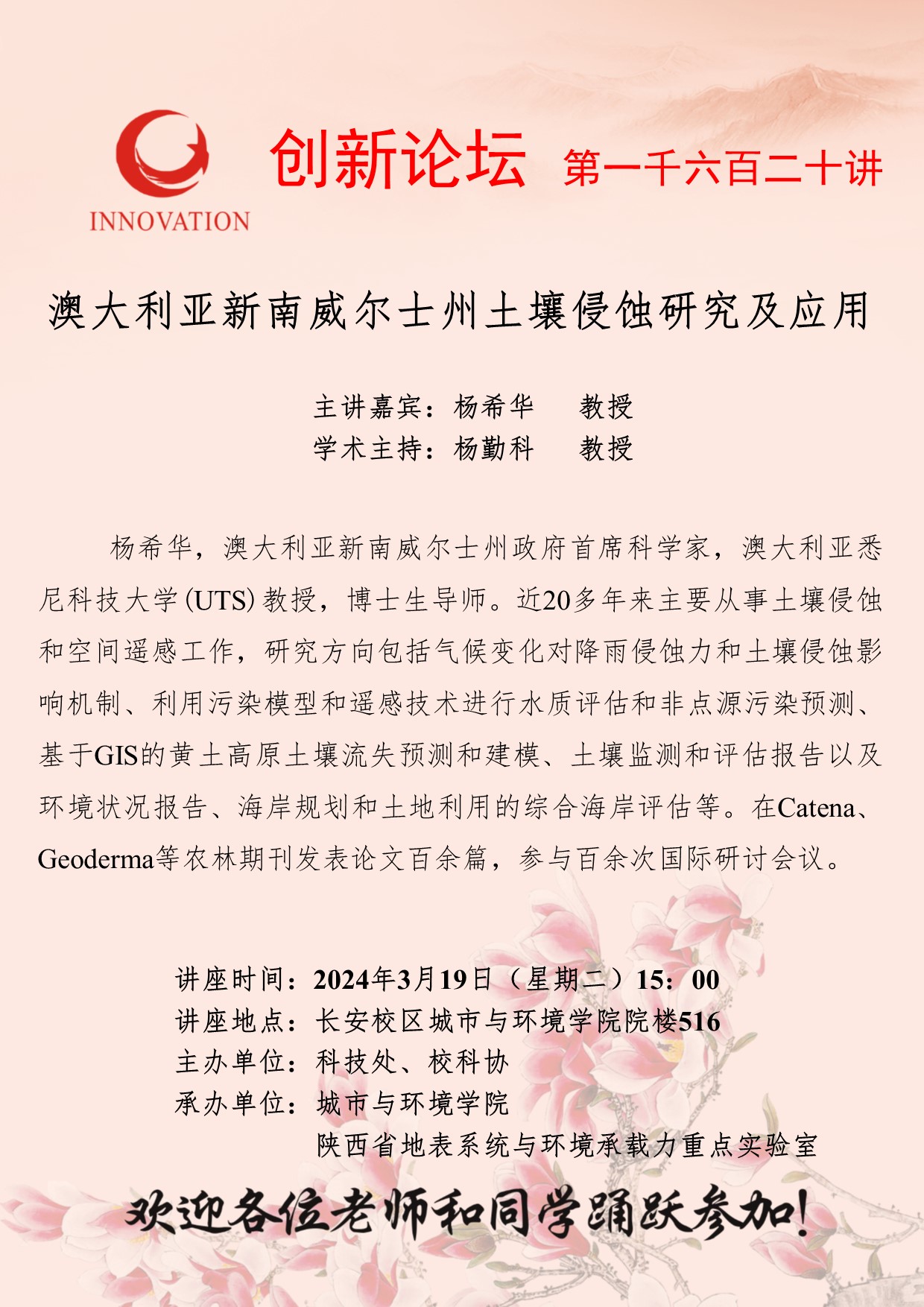 杨希华 教授 乐动网页版登录入口创新论坛第一千六百二十讲:澳大利亚新南威尔士州土壤侵蚀研究及应用 讲座时间 2024年3月19日(星期二)15:00 讲座地点 长安校区城市与环境学院院楼516 讲座人介绍 杨希华 教授 讲座内容