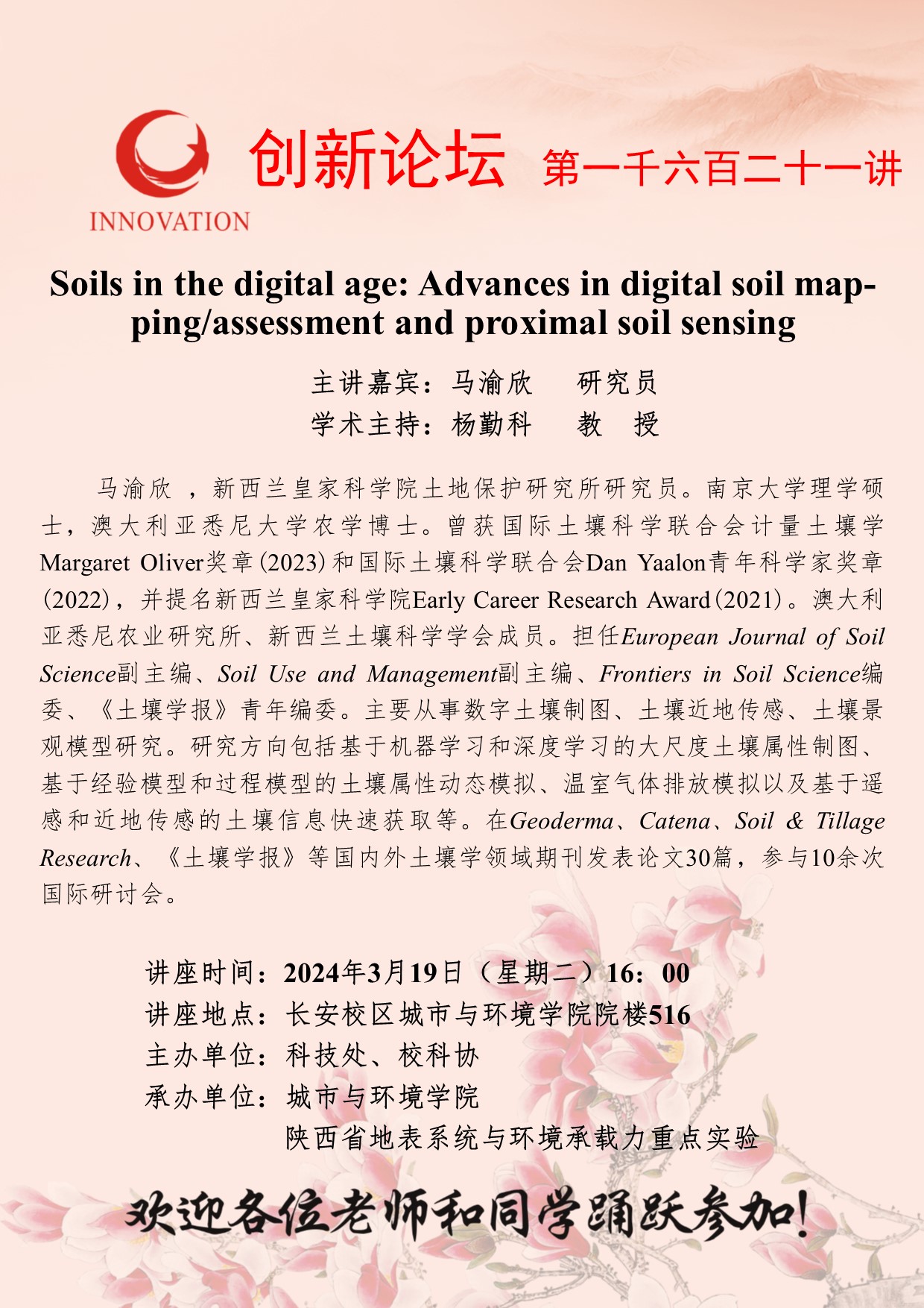 马渝欣 研究员 乐动网页版登录入口创新论坛第一千六百二十一讲:Soils in the digital age: Advances in digital soil mapping/assessment and proximal soil sensing 讲座时间 2024年3月19日(星期二)16:00 讲座地点 长安校区城市与环境学院院楼516 讲座人介绍 马渝欣 研究员 讲座内容