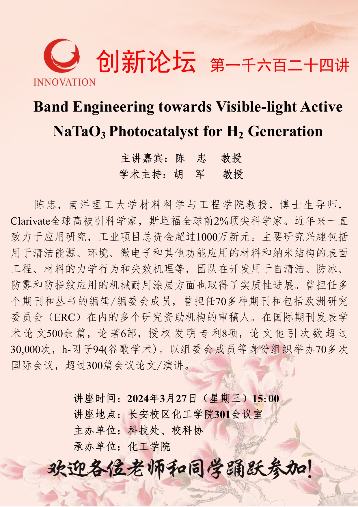 陈忠 教授 乐动网页版登录入口创新论坛第一千六百二十四讲:Band Engineering towards Visible-light Active NaTaO3 Photocatalyst for H2 Generation 讲座时间 2024年3月27日(星期三)15:00 讲座地点 长安校区化工学院301会议室 讲座人介绍 陈忠 教授 讲座内容