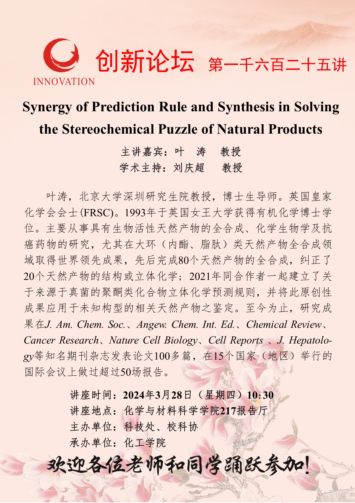 叶涛 教授 乐动网页版登录入口创新论坛第一千六百二十五讲:Synergy of Prediction Rule and Synthesis in Solving the Stereochemical Puzzle of Natural Products 讲座时间 2024年3月28日(星期四)10:30 讲座地点 化学与材料科学学院217报告厅 讲座人介绍 叶涛 教授 讲座内容