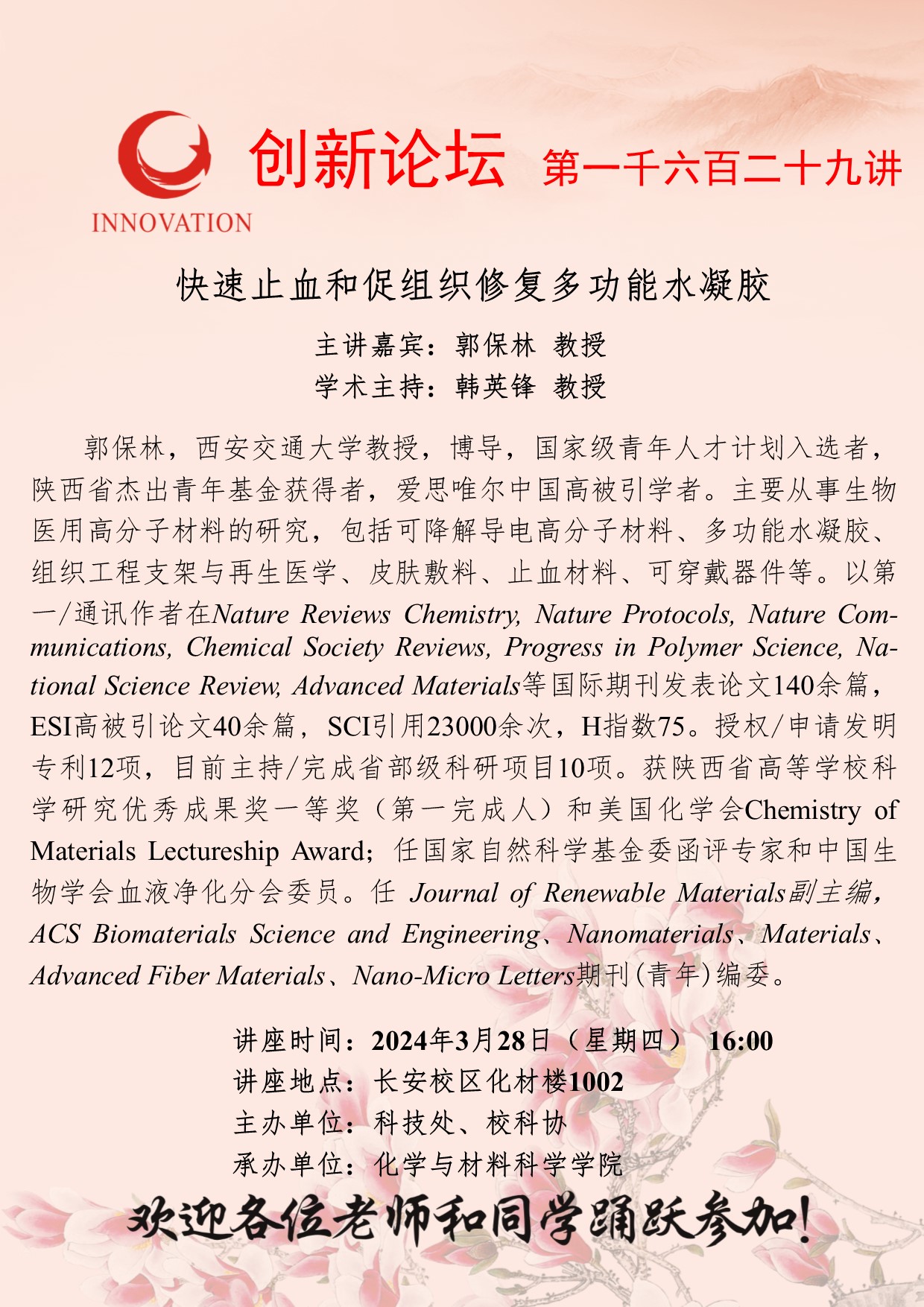 郭保林 教授 乐动网页版登录入口创新论坛第一千六百二十九讲:快速止血和促组织修复多功能水凝胶 讲座时间 2024年3月28日(星期四) 16:00 讲座地点 长安校区化材楼1002 讲座人介绍 郭保林 教授 讲座内容