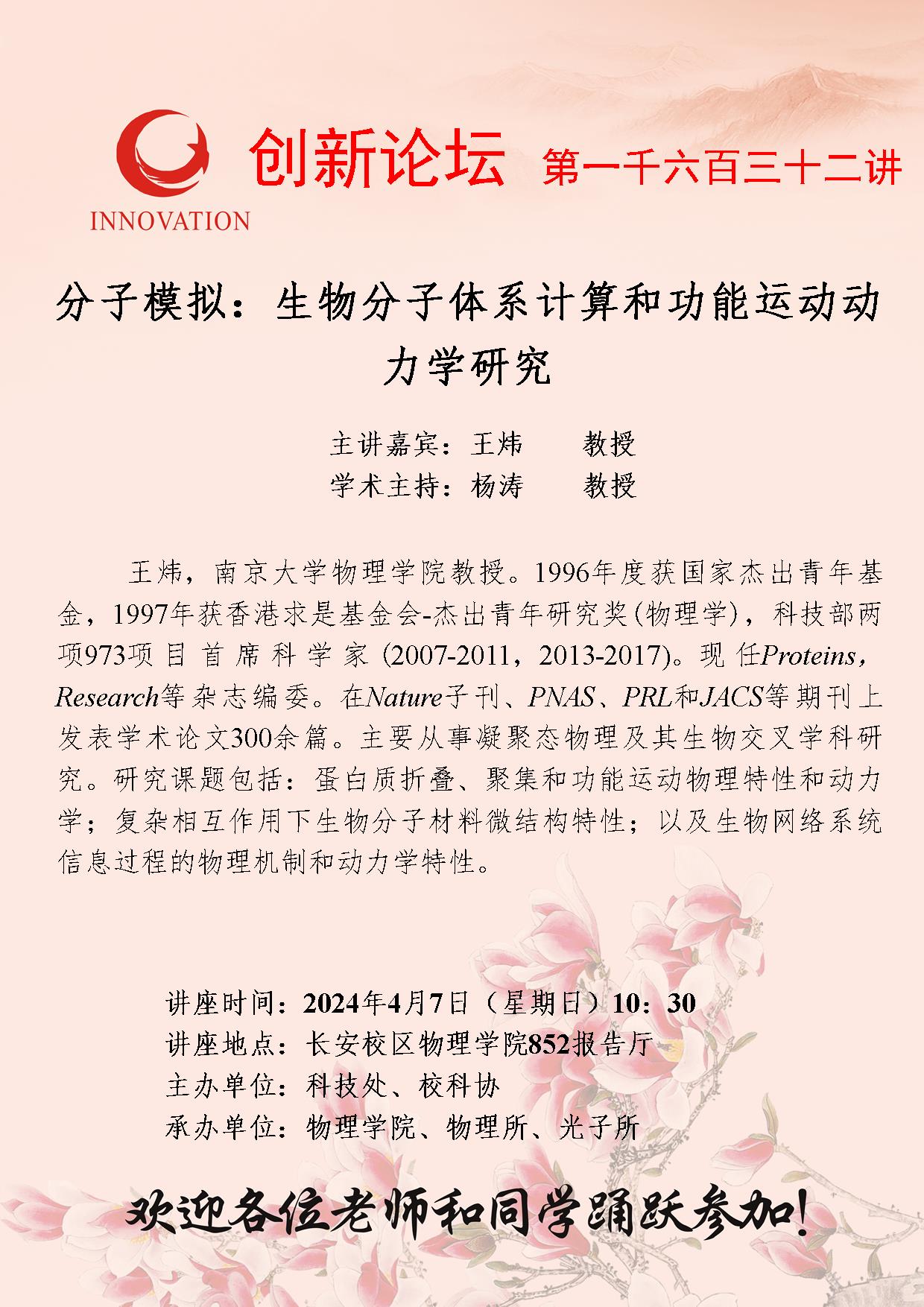 王炜 教授 乐动网页版登录入口创新论坛第一千六百三十二讲:分子模拟:生物分子体系计算和功能运动动力学研究 讲座时间 2024年4月7日(星期日)10:30 讲座地点 长安校区物理学院852报告厅 讲座人介绍 王炜 教授 讲座内容