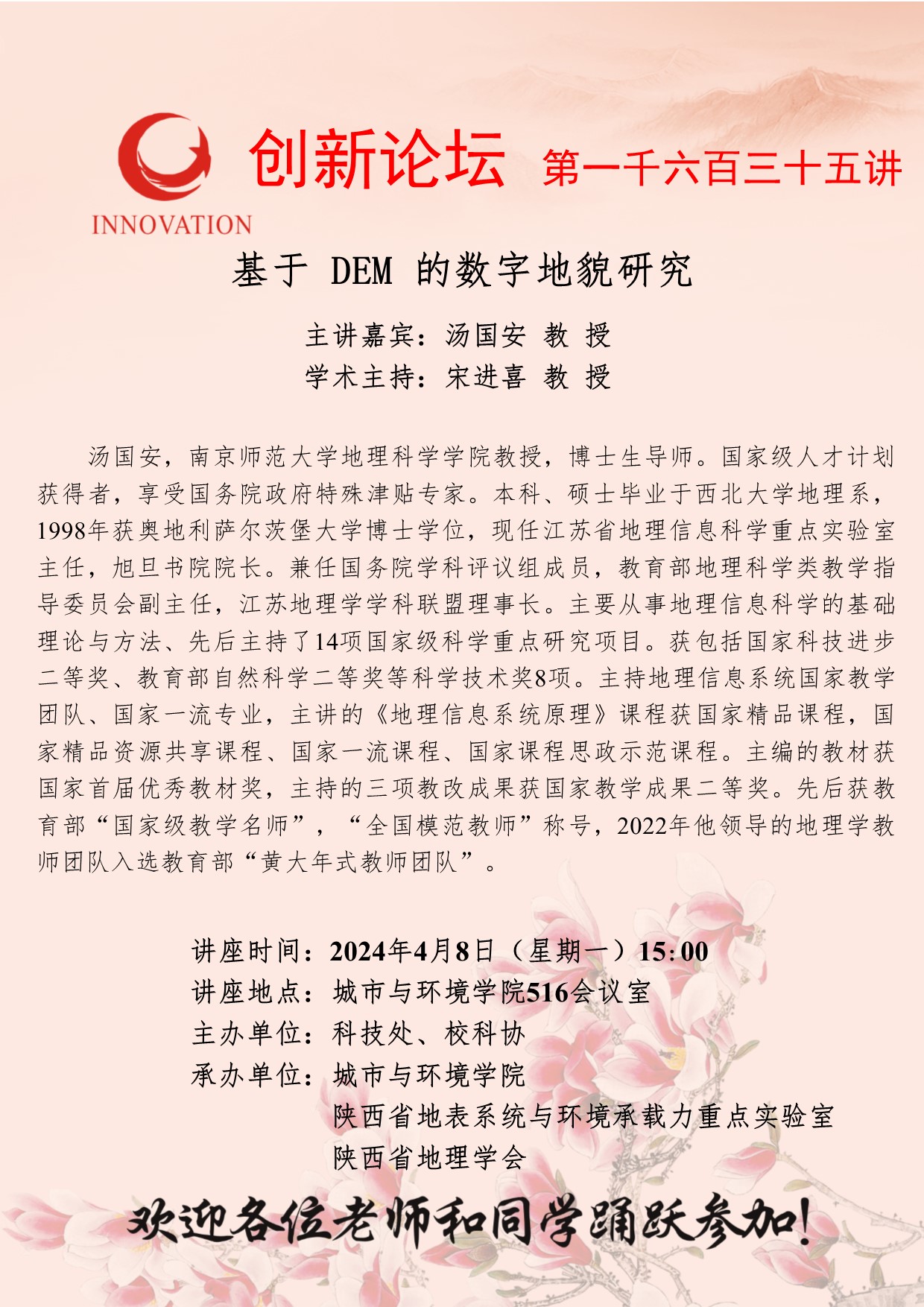 汤国安 教授 乐动网页版登录入口创新论坛第一千六百三十五讲:基于 DEM 的数字地貌研究 讲座时间 2024年4月8日(星期一)15:00 讲座地点 城市与环境学院516会议室 讲座人介绍 汤国安 教授 讲座内容