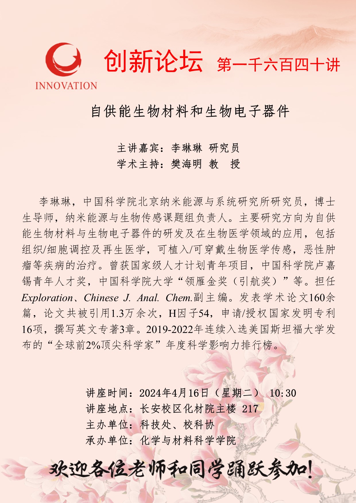 李琳琳 研究员 乐动网页版登录入口创新论坛第一千六百四十讲:自供能生物材料和生物电子器件 讲座时间 2024年4月16日(星期二) 10:30 讲座地点 长安校区化材院主楼 217 讲座人介绍 李琳琳 研究员 讲座内容