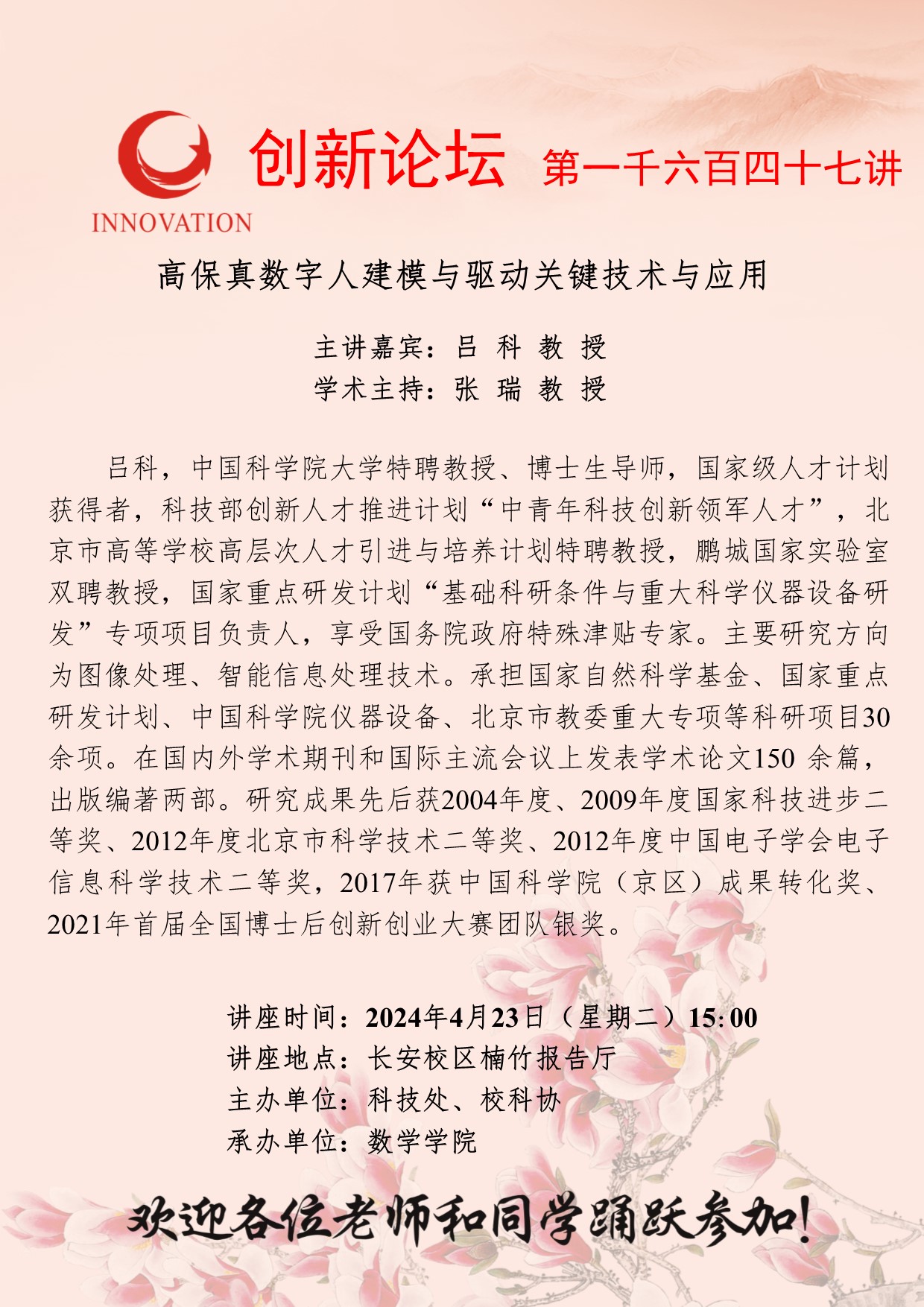 吕科 教授 乐动网页版登录入口创新论坛第一千六百四十七讲:高保真数字人建模与驱动关键技术与应用 讲座时间 2024年4月23日(星期二)15:00 讲座地点 长安校区楠竹报告厅 讲座人介绍 吕科 教授 讲座内容