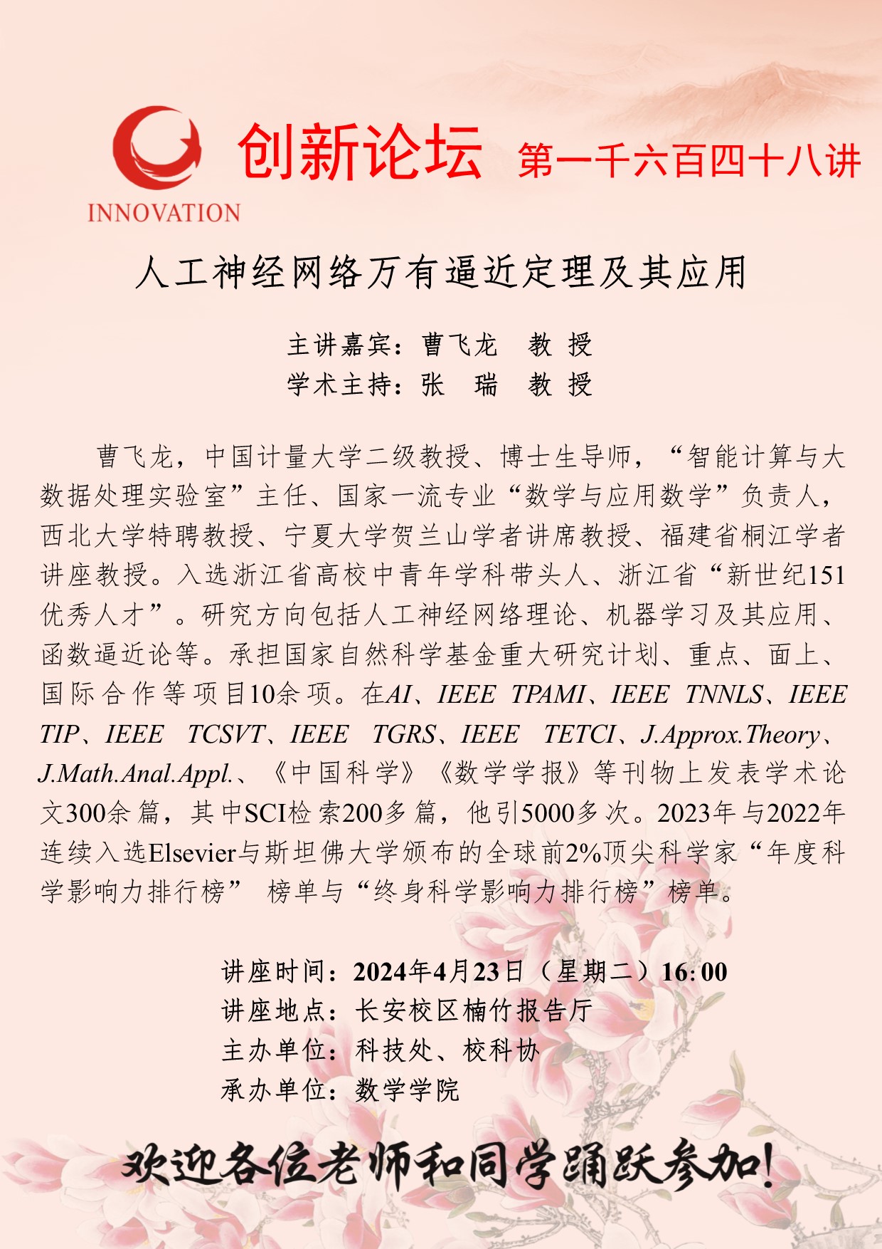 曹飞龙 教授 乐动网页版登录入口创新论坛第一千六百四十八讲:人工神经网络万有逼近定理及其应用 讲座时间 2024年4月23日(星期二)16:00 讲座地点 长安校区楠竹报告厅 讲座人介绍 曹飞龙 教授 讲座内容