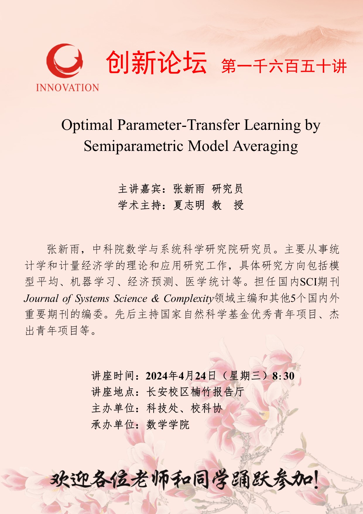 张新雨 研究员 乐动网页版登录入口创新论坛第一千六百五十讲:Optimal Parameter-Transfer Learning by Semiparametric Model Averaging 讲座时间 2024年4月24日(星期三)8:30 讲座地点 长安校区楠竹报告厅 讲座人介绍 张新雨 研究员 讲座内容