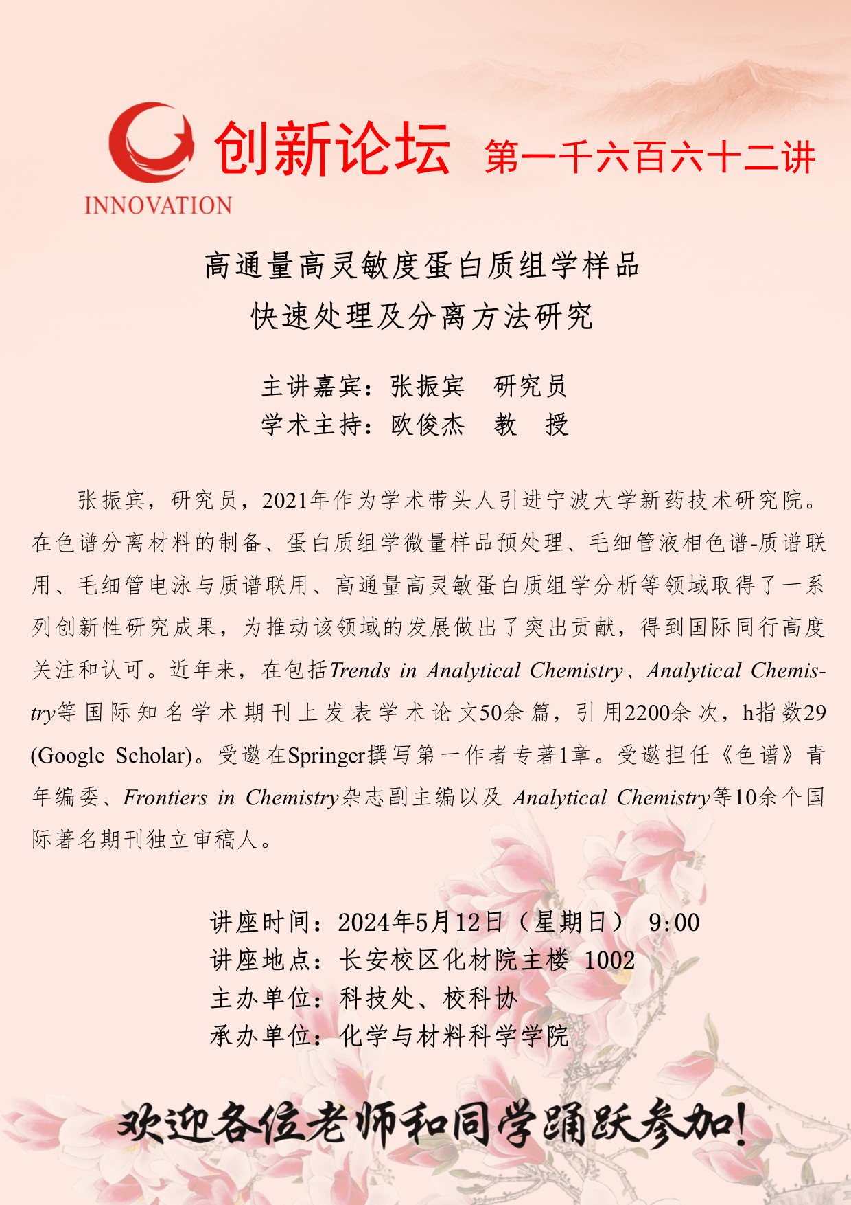 张振宾 研究员 乐动网页版登录入口创新论坛第一千六百六十二讲:高通量高灵敏度蛋白质组学样品快速处理及分离方法研究 讲座时间 2024年5月12日(星期日) 9:00 讲座地点 长安校区化材院主楼 讲座人介绍 张振宾 研究员 讲座内容